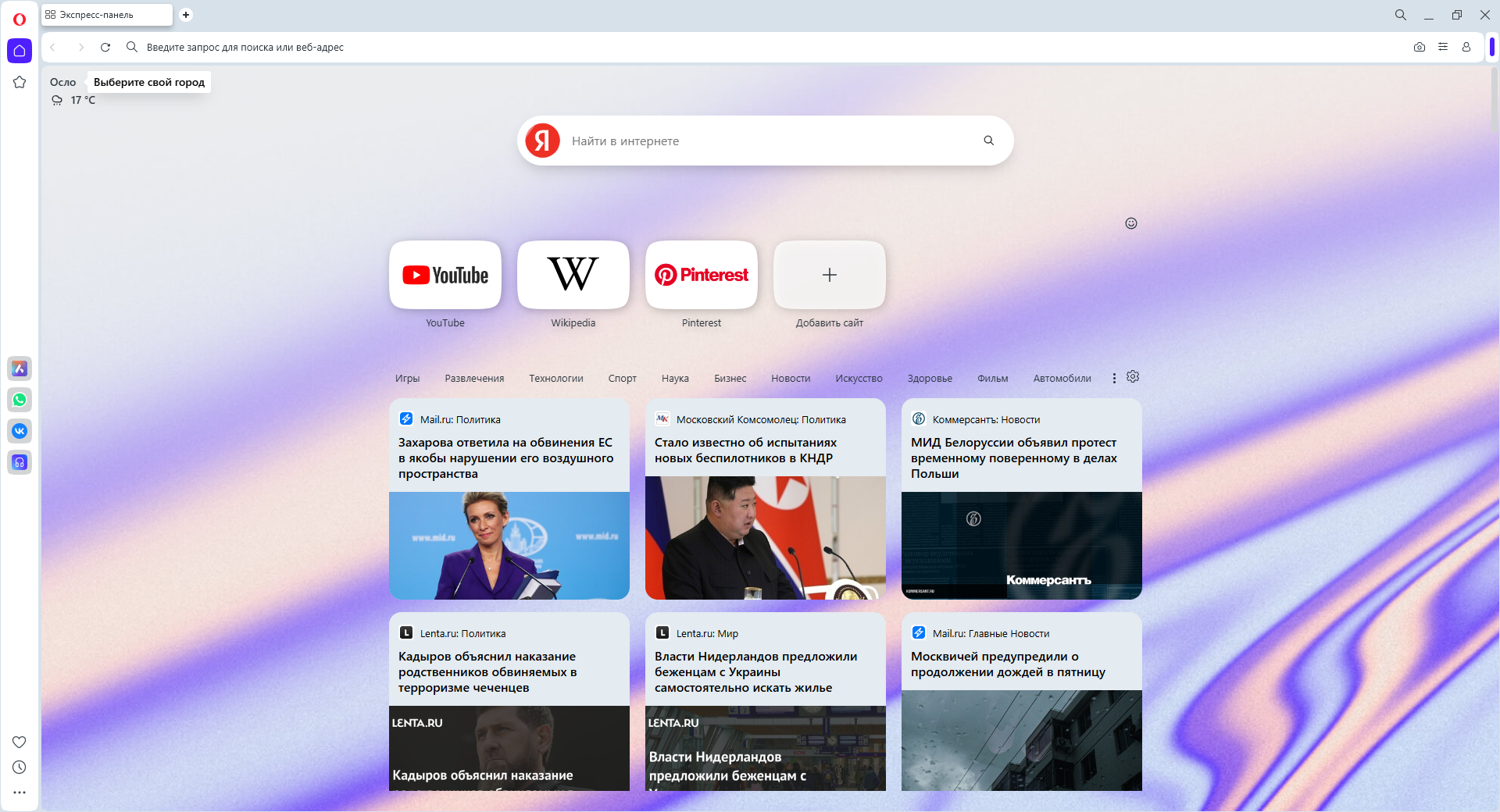 Интерфейс Opera сочетает в себе точность и качество. Opera включает современный стиль и мощные опции, предоставляя вам полную свободу исследования просторов Интернета.
