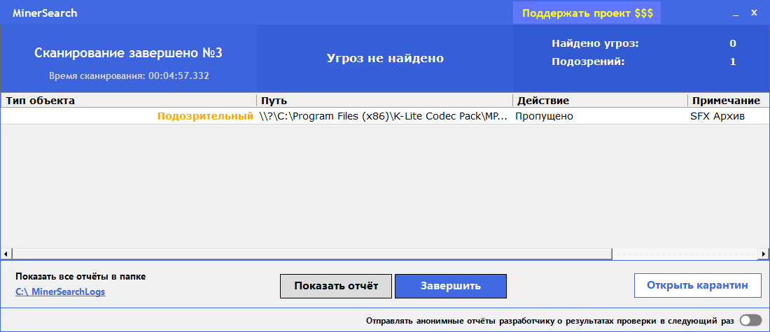 Запустить приложение. Дождаться окончания сканирования. При первом использовании программы предлагается сообщать о результатах проверки автору на ваше усмотрение. После окончания будет показана форма с кратким отчётом об угрозах, которые были устранены. С подробным отчётом можно ознакомиться, нажав на кнопку "Открыть отчёт". При нажатии на кнопку Карантин откроется Менеджер карантина, в котором вы можете полностью удалить файл или восстановить.