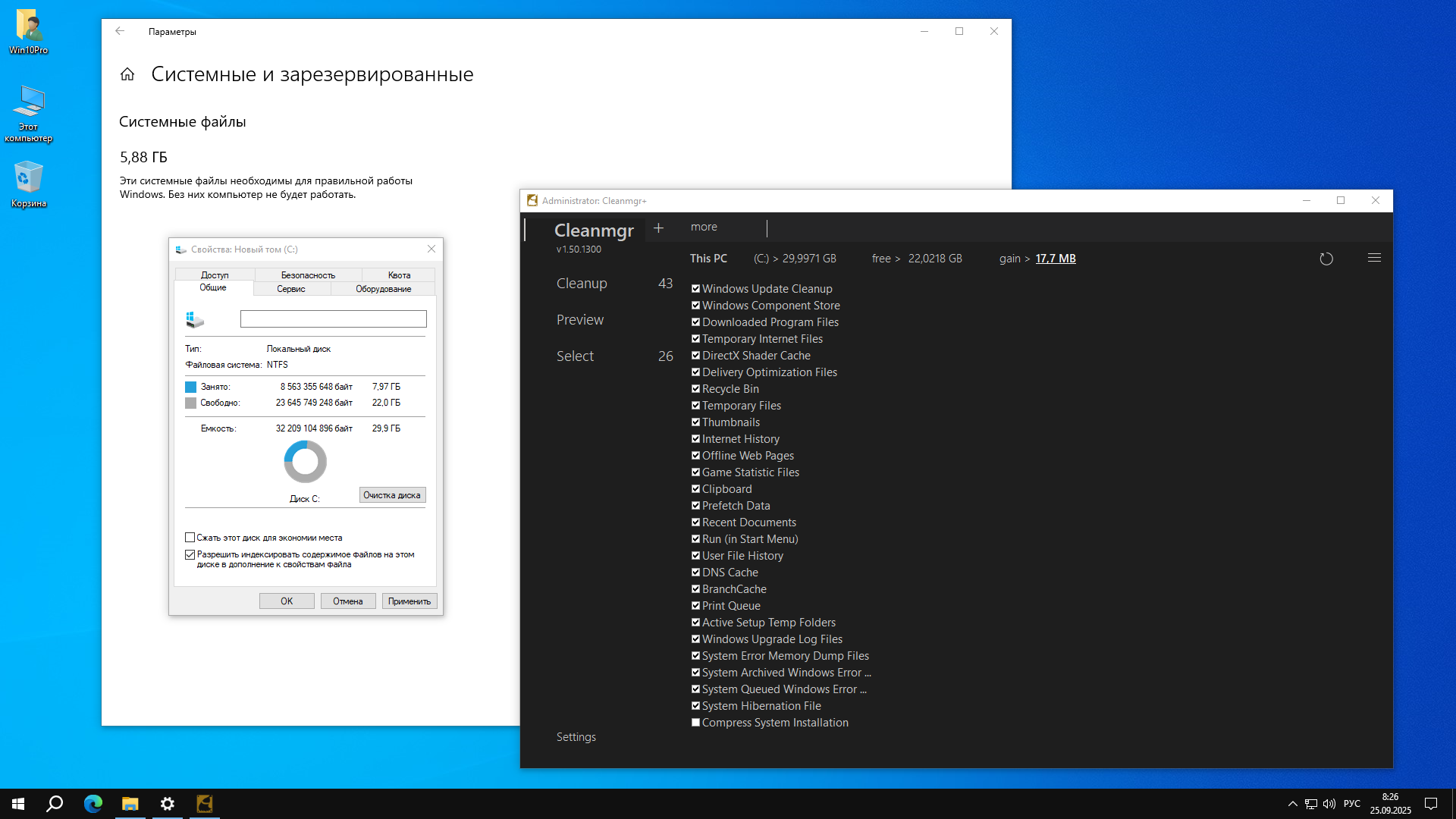 Программная утилита Cleanmgr+ для чистки Windows 7/8.1/10/11, которая не сломает систему, но очистит от нежелательного хлама и мусора, есть пункт «сжатие для экономии места». Программная утилита Cleanmgr+ по факту уже настроена, остаётся только запустить и дождаться окончания процесса.