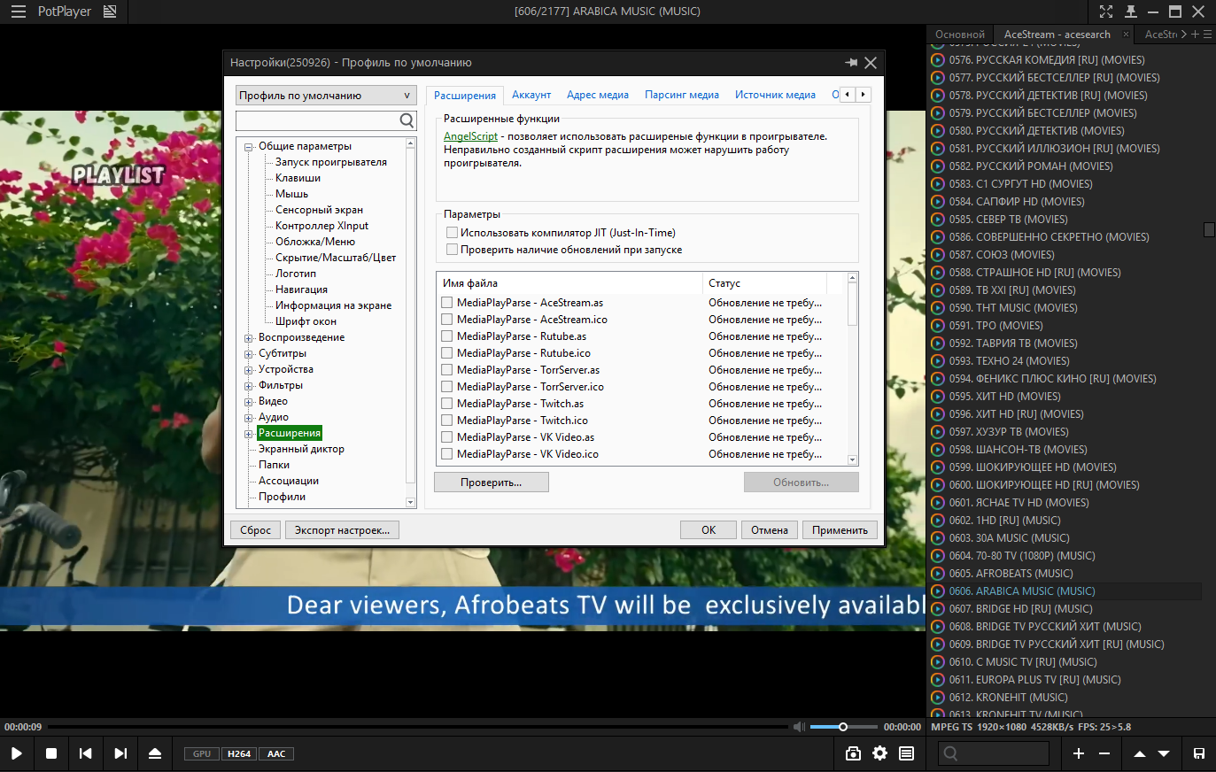 TorrServer MatriX- дополнительно для удобного просмотра по magnet-ссылкам. Копируем в буфер magnet-ссылку (как правило доступна на любом трекере). Запускаем плеер -> Открыть -> Открыть URL-адрес... -> Вставляем ссылку и смотрим **Ace Stream Engine- облегчённая и портативная версия Ace Stream Medias на базе билда 3.1.16 без рекламы и плеера, для просмотра Torrent TV в PotPlayer. Если установлен оригинальный Ace Stream, рекомендуется предварительное удаление. Устанавливается вместе с самообновляемым плейлистом AceStream (1500+ каналов) и Autoit скриптом, который: