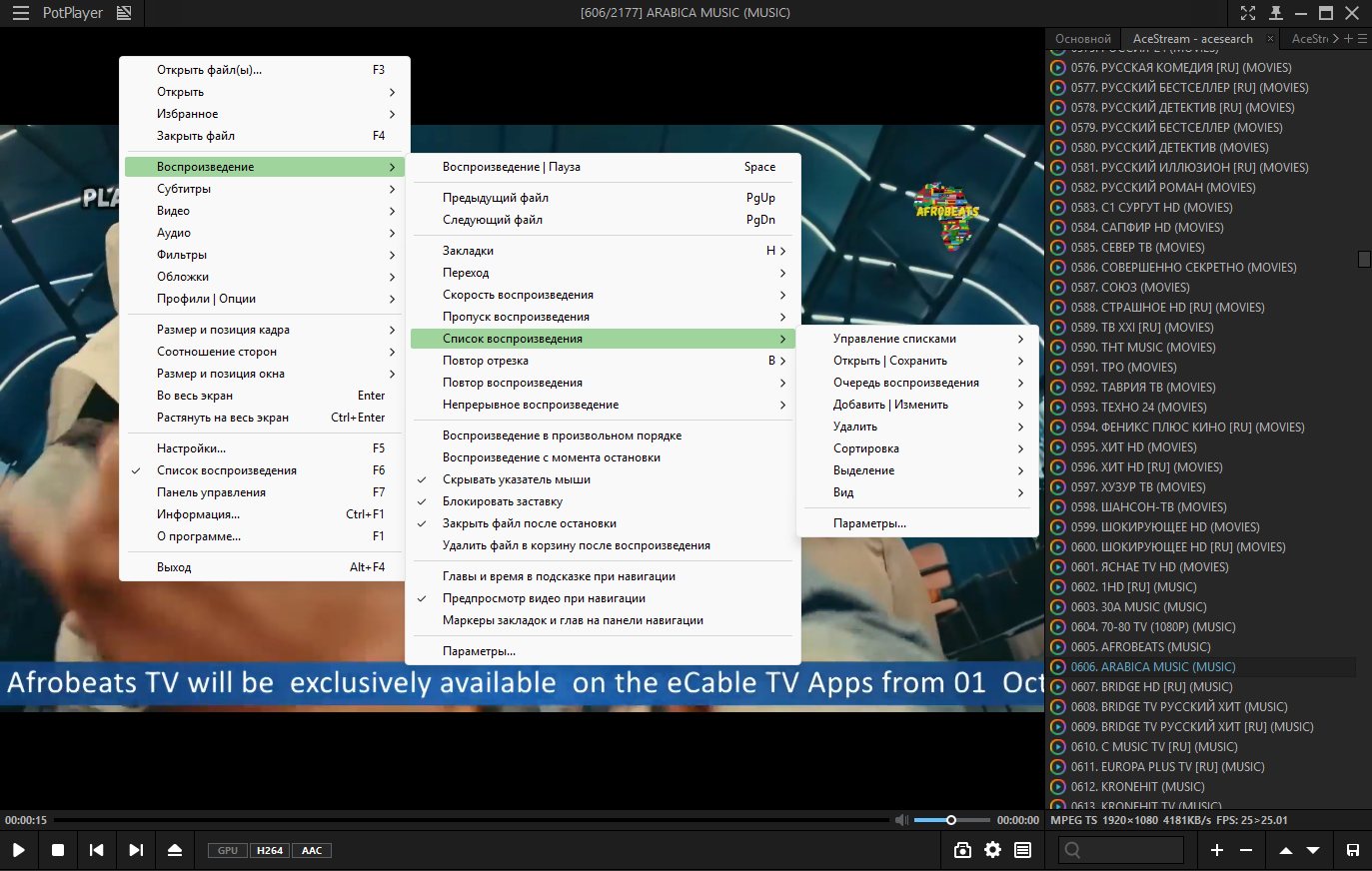 - Плейлисты (IPTV и Ace Stream)