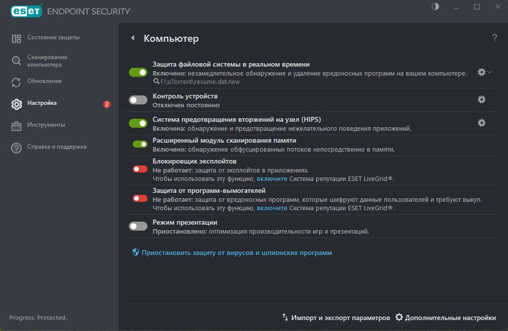 ESET Endpoint Security — это комплексное решение для обеспечения безопасности, являющееся результатом долгих усилий, направленных на достижение оптимального сочетания максимальной степени защиты с минимальным влиянием на производительность компьютера. Современные технологии, основанные на применении искусственного интеллекта, способны превентивно противодействовать заражениям вирусами, шпионскими, троянскими, рекламными программами, червями, руткитами и другими атаками из Интернета без влияния на производительность компьютера и перерывов в работе. ESET Endpoint Antivirus — это приложение для про-активной защиты клиентских компьютеров от любых типов вредоносного ПО. Блокирует работу вирусных приложений и исключает вероятность утечки личной информации.