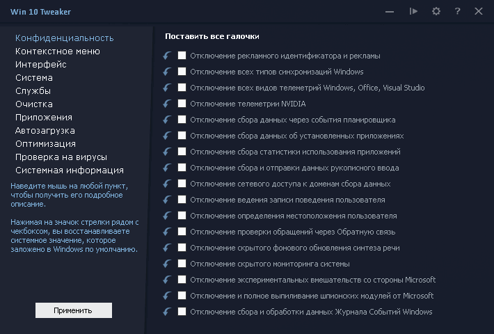 Win 10 Tweaker позволяет проверять файлы на вирусы,