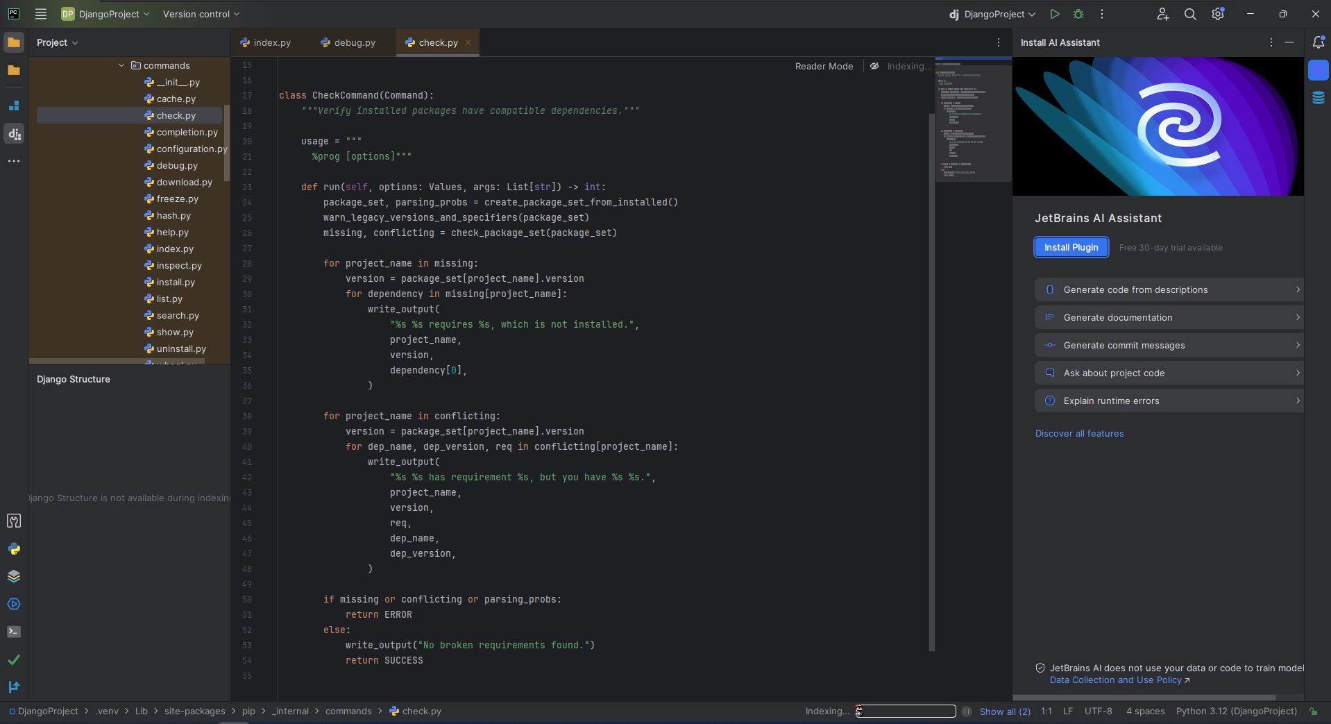 • Помощь при написании кода, включающая в себя автодополнение, авто-импорт, шаблоны кода, проверка на совместимость версии интерпретатора языка, и многое другое.