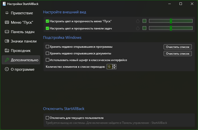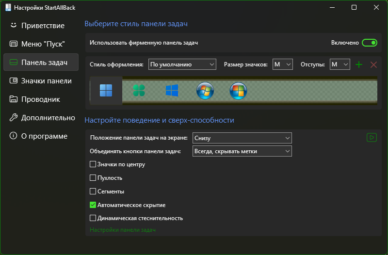 - Позволяет настроить отображение и поведение меню «Пуск» и интерфейса Windows 11: скины, изображение кнопки, активные углы экрана и многое другое.