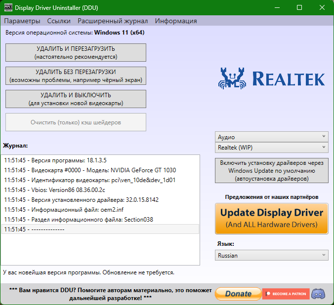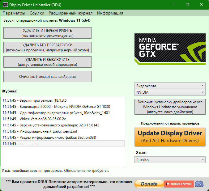 - Display Driver Uninstaller лучше всего работает когда компьютер запущен через безопасный режим.