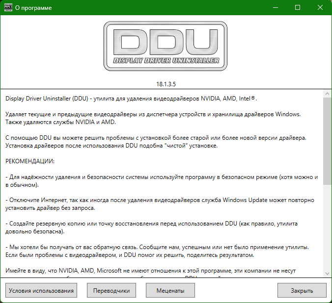 Display Driver Uninstaller это утилита удаления драйверов, которая поможет вам полностью удалить драйверы видеокарты AMD / NVIDIA / Intel и драйверы звуковой карты Realtek / Sound Blaster из системы, не оставляя кучу ненужных файлов (включая ключи реестра, папки и файлы). DDU предназначен для использования в случаях, когда стандартными способами драйвера не удаляются, или когда нужно тщательно удалить драйверы видеокарты. После использования этого инструмента будет так, будто драйверов не было, как при чистой установке системы. Как и для любого инструмента такого рода, рекомендуется создать новую точку восстановления системы перед ее использованием, чтобы можно было вернуть прежнее состояние системы, если вы столкнетесь с проблемами.