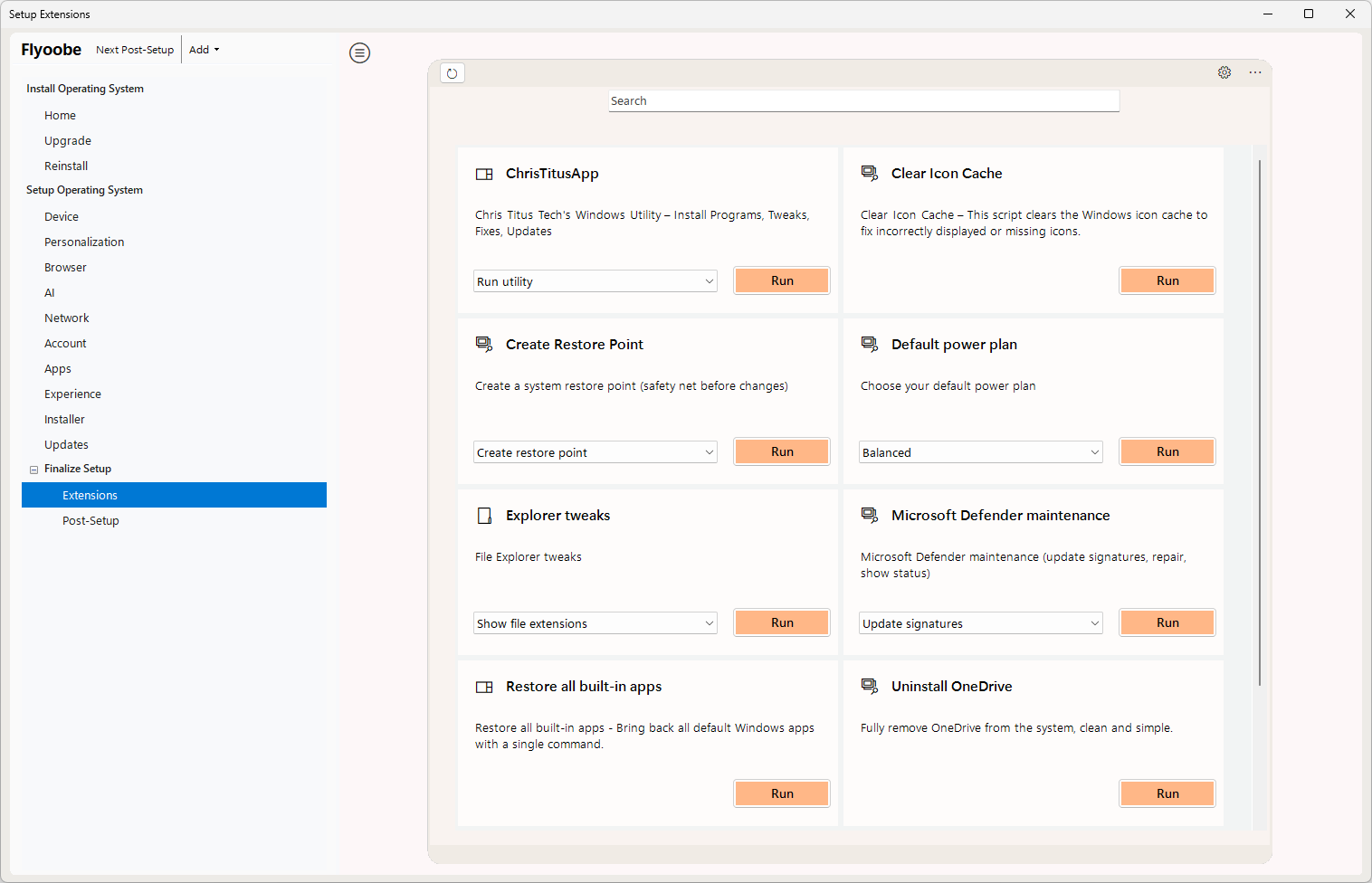 - The OOBE installer has been improved and expanded. It’s now possible to manually search and install app packages directly from the Winget manifest using the new “Install custom Winget package” option. The feature is a bit more barebones than UnigetUI, but intentionally lightweight to keep Flyoobe fast and efficient as it covers everything essential.