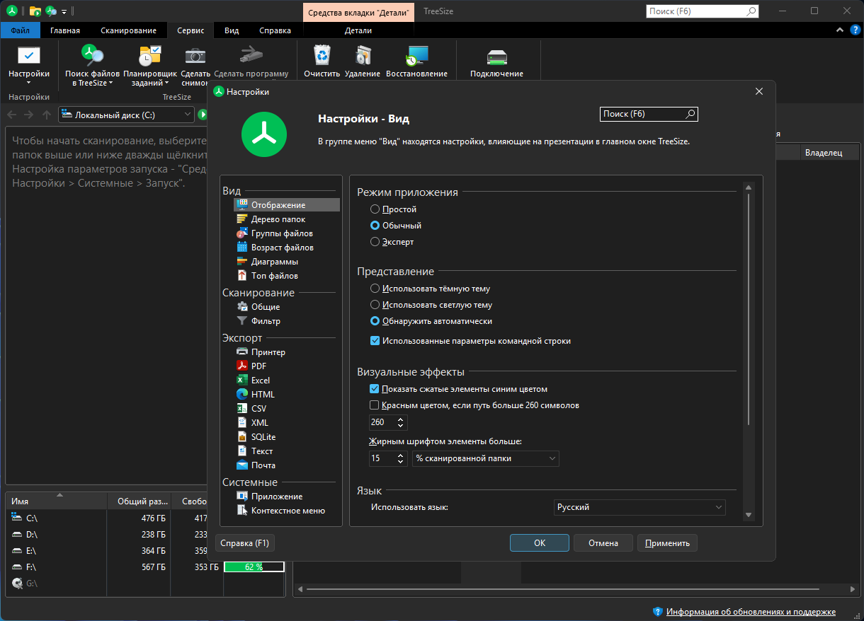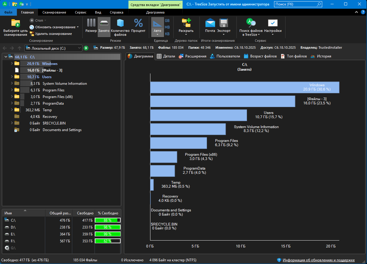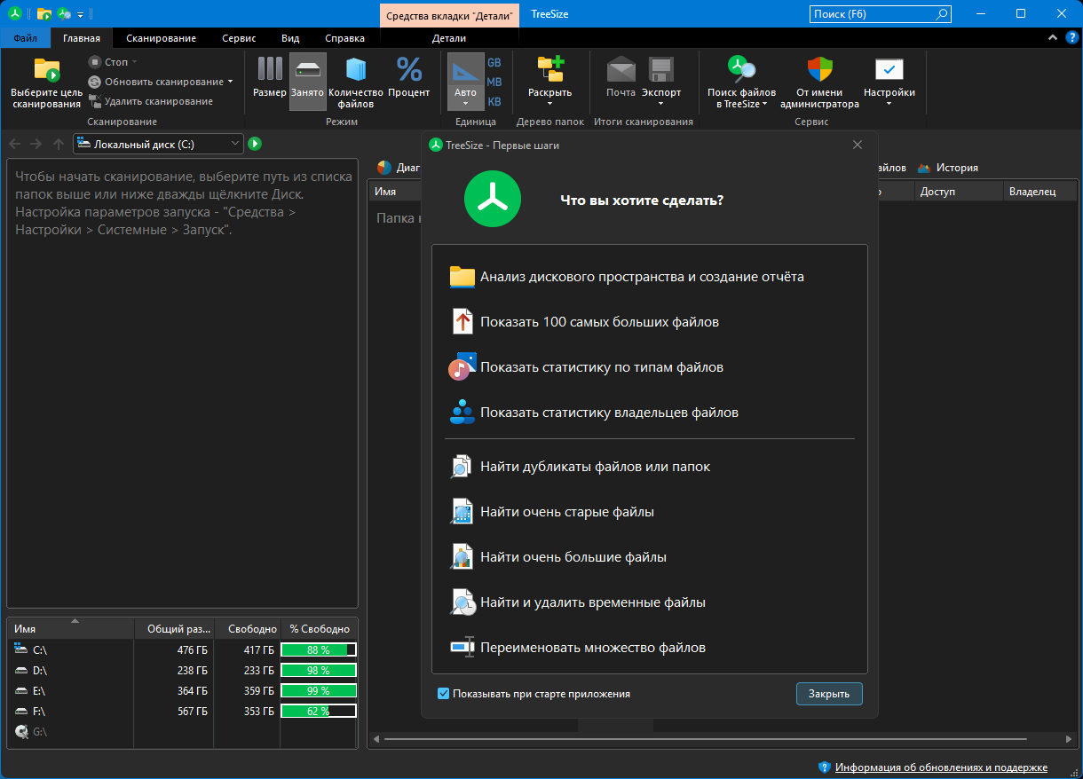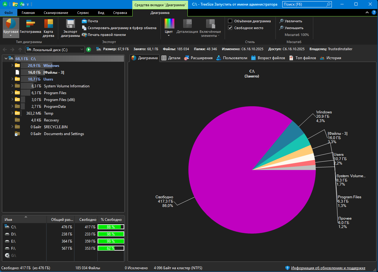 Древовидные карты визуализируют иерархии и размеры подпапок в выбранном каталоге.