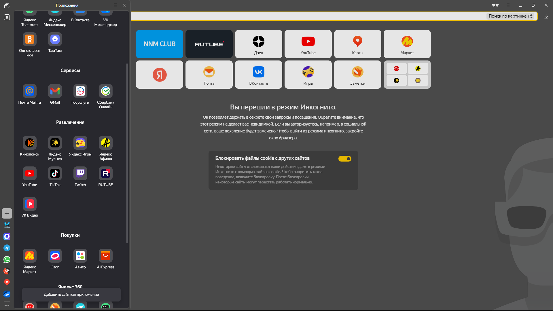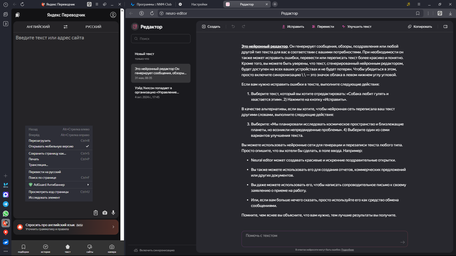 Нейросеть YandexGPTпоможет писать или улучшать ваши тексты, генерировать картинки, а также встроенные нейросети переведут видео с восьми иностранных языков, сделает краткий пересказ видео и статей, чтобы вы быстрее поняли главное. Перевод картинок Переводите текст с картинок на любой язык с помощью встроенного переводчика. Также встроенный переводчик показывает слова и фразы на том языке, который используется в интерфейсе Яндекс Браузера.[brc]Перевод и озвучка видео Вы можете смотреть с русской озвучкой практически любой англоязычный ролик. Теперь «озвучка» роликов на иностранных языках стала многоголосой. Количество «актёров» увеличилось с двух до двенадцати: шесть мужских и столько же женских. Мы приглушаем оригинальную звуковую дорожку — так, чтобы она была слышна, но не мешала восприятию — и накладываем на неё новую, с переводом. Сейчас видео переводится на русский с английского, французского, немецкого, испанского и итальянского языков. Технология находится в разработке, поэтому перевод доступен не для всех видео. Также в режиме тестирования находится и технология автоматического закадрового перевода прямых трансляций на YouTube.[brc]Субтитры Яндекс Браузер поддерживает субтитры для видео, которое может перевести. Можно включить субтитры для языка оригинала (английский, французский, немецкий и испанский), для языка перевода (русский), а также в видео на русском языке. Сейчас субтитры работают только для видео на YouTube[brc]Экспорт паролей в файл Вы можете экспортироватьпароли в файл и импортировать их обратно в браузер.[brc]Блокировка трекеров Недобросовестные трекерымогут передавать третьим лицам ваши личные данные (номер телефона или адрес электронной почты). Технология YTP позволяет посмотреть, какие трекеры работают на странице, и заблокировать те из них, которым вы не доверяете.[brc]Табло На Таблоотображаются сайты, которые вы посещаете чаще всего. Набор и последовательность плиток можно настроить вручную. Табло открывается, когда вы нажимаете на Умную строкуили открываете новую вкладку.[brc]Веб-приложения Многие сайты давно заменяют полноценные программы. Используйте любимые сервисы как веб-приложения— добавьте их на боковую панель для быстрого доступа и открывайте в отдельном окне, а не ищите нужную вкладку.[brc]Отзывы на сайтах Одни сайты полезны, а другие — нет. В браузере любой пользователь может оставить отзыв о сайте, который он посетил. Отзывы позволяют делиться мнением и помогают сделать выбор на основе рекомендаций.[brc]Группы вкладок С группами вкладоквы легко наведете порядок в браузере. Вы можете создавать новые группы, распределять по ним вкладки и перемещать вкладки между группами — всё для того, чтобы максимально удобно работать с открытыми вкладками.[brc]Мессенджер В Мессенджеревы можете общаться с друзьями, организациями или Алисой, читать и создавать каналы. Сообщения можно оценивать с помощью эмодзи или стикера. Доступны текстовые и голосовые сообщения с автораспознаванием, а также аудио- и видеозвонки.[brc]Боковая панель Боковая панельпозволяет запустить Алису, воспроизводить музыку, сохранять заметки о важном. Предоставляет быстрый доступ к поиску по странице, истории, закладкам, уведомлениям и сервисам Яндекса.[brc]Скриншоты Теперь вы сможете создать скриншоти поделиться им в несколько кликов. При