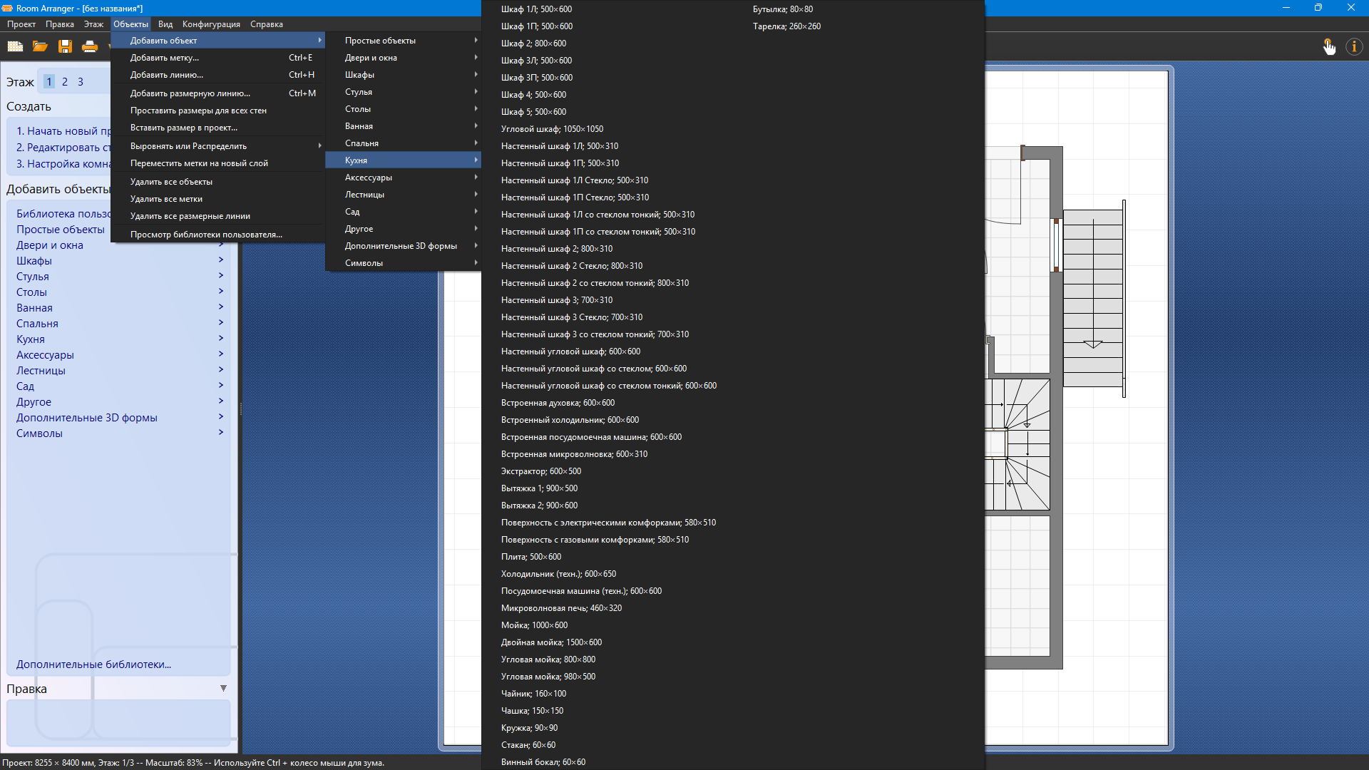 - Перенос предметов мебели по квартире осуществляется кликом мыши. Задайте размеры комнат и мебели, толщину стен, а потом просто расставляйте всё по местам. В программе заложены стандартные размеры шкафов, бытовой техники, светильников, розеток, выключателей и т.д.Для наполнения комнат вы сможете взять готовые модели с любыми размерами из библиотеки, можете создавать свои модели и создавать свою библиотеку из тех моделей, которые используются наиболее часто.