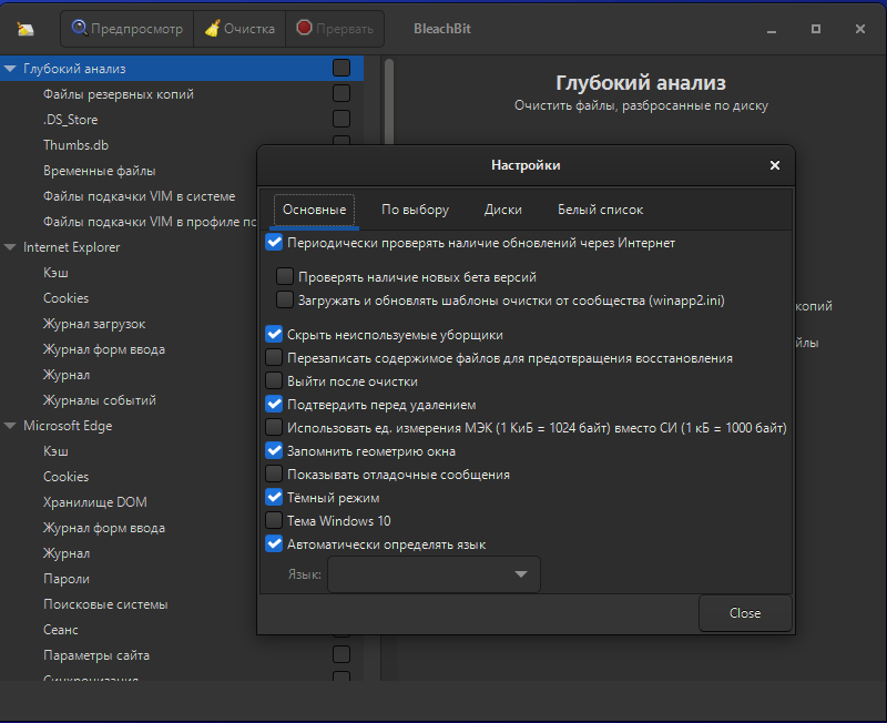 • BleachBit имеет возможность предварительного просмотра всех намеченных действий, а после завершения, возможен просмотр выполненных процедур с выводом размера освобождённого пространства. • После запуска программы - переходите в «Настройки». Вам нужно установить всего одну галочку - загружать и обновлять шаблоны от сообщества (на Ваше усмотрение (добавятся дополнительные пункты)) и перезапустить программу.