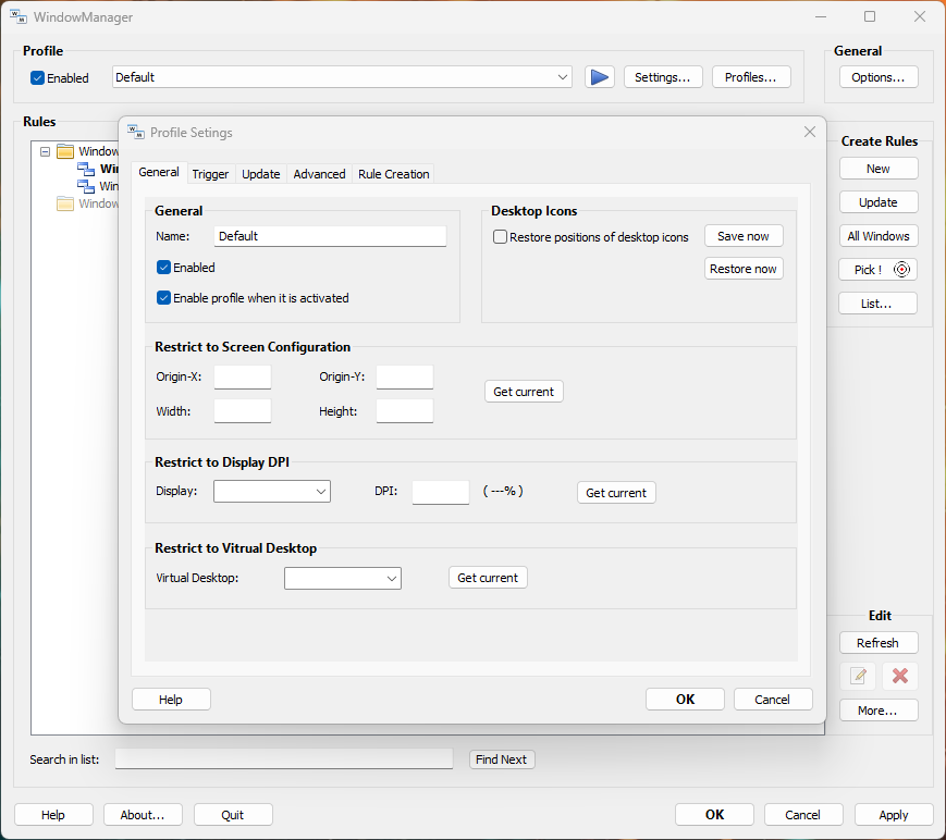 Вообще возможности программы намного больше, чем простое восстановление размеров и позиций, программа умеет сворачивать окна, в том числе и в трей, есть система профилей, переключение между которыми происходит, если произойдет какое то, определенное вами в правилах событие, умеет различать окна одной и той же программы по заголовкам, позволяет настроить поведение для второго и последующего открытого окна одной программы, может запоминать режим просмотра в проводнике windows и много другое.