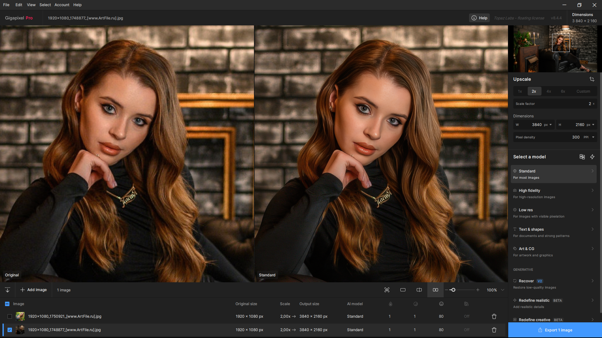 Описание: Topaz A.I. Gigapixel — это приложение, использующее силу искусственного интеллекта для увеличения ваших изображений, добавляя естественные детали для удивительного результата. Используя технологию глубокого обучения, A.I.Gigapixel ™ может увеличить изображение и заполнить детали, которые другие продукты для изменения размеров не учитываются. Эти традиционные методы создают изображения, которые размыты, не реалистично живописны и не имеют деталей, которые присутствуют в изображениях с высоким разрешением.Основные возможности:Повышение разрешения изображения вместо простого увеличения пикселей. Гигапиксельный искусственный интеллект очень хорошо помогает вам сделать одну вещь: увеличить разрешение изображения естественным образом. Это довольно сложно сделать. Большинство алгоритмов апскейлинга не знают, как точно заполнить недостающие пиксели, поэтому в итоге вы получите блочные результаты низкого качества. Чтобы решить эту проблему, нейронные сети Gigapixel AI постоянно обучаются на самых разных образцах изображений, чтобы понять, как выглядят фотореалистичные детали. Изучив миллионы изображений, наш апскейлер изображений с искусственным интеллектом теперь может достоверно увеличивать разрешение самых разных объектов (портреты, дикая природа, пейзажи, архитектура и т. д.) и типов изображений (DSLR, Интернет/сжатые, компьютерная графика). Результаты часто волшебные. Попробуйте наш интеллектуальный усилитель разрешения изображений! Восстанавливайте естественные детали и текстуры на лицах с низким разрешением с помощью Face Recovery AI. Революционная технология Face Recovery AI, представленная в Gigapixel AI v6.1, обеспечивает значительное улучшение детализации лиц с низким разрешением. Здесь вы увидите мелкие детали и текстуры, точно созданные с помощью Face Recovery AI с одновременным масштабированием на 600%. Добавьте детали изображения, которые выглядят совершенно естественно. Обычно увеличение изображения изначально низкого качества приводит к появлению нечетких квадратных артефактов, которые визуально ухудшают изображение. Поскольку гигапиксельный ИИ был обучен на обширном наборе данных горных текстур (среди прочего), он может увеличивать детали изображения при увеличении разрешения. Вы почти не можете сказать, что использовался апскейлер AI. Улучшить текстуру перьев Перья часто трудно правильно улучшить; они должны быть одновременно резкими и мягкими в разных местах, чтобы выглядеть естественно. Хотя это сложно для обычных методов увеличения, Gigapixel AI понимает, как правдоподобно увеличить детализацию перьев. Улучшить текстуру и резкость меха Мех — еще одна сложная тема из-за ультратонких деталей различной ширины и текстуры. При масштабировании животных Gigapixel AI добавляет правдоподобную детализацию и текстуру меха, сохраняя при этом боке в соответствующих местах для тех результатов, которые вы видите выше. Пейзажи с более высоким разрешением Пейзажи часто выглядят неестественно без мелких деталей. Гигапиксельный искусственный интеллект может добавить правдоподобную текстуру из существующих деталей и значительно повысить качество изображения ваших пейзажей. Более подробные городские пейзажи Рукотворная архитектура часто имеет более прямые и четкие линии, чем природа. Специальная модель искусственного интеллекта «Линии» от
