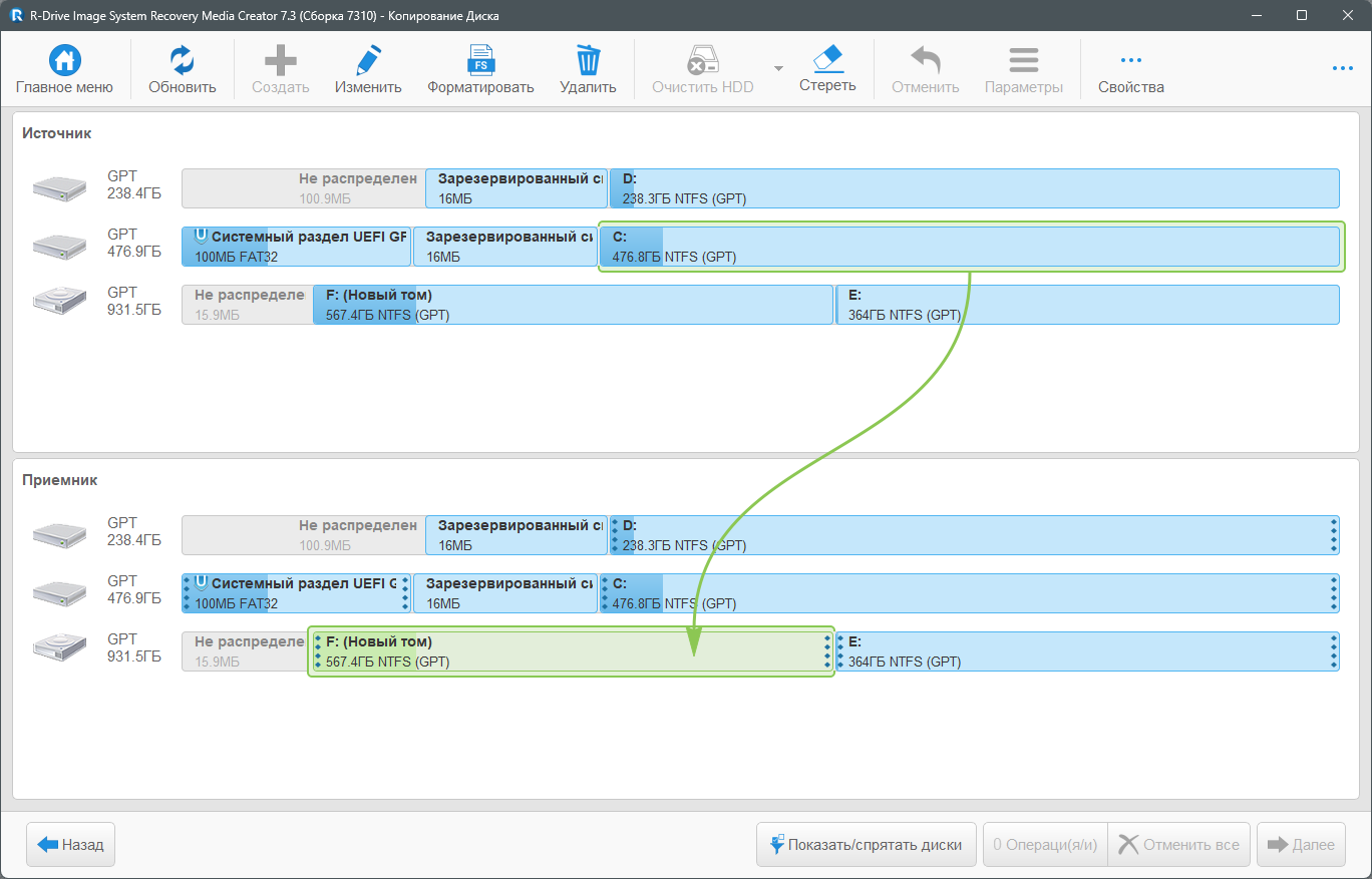 - Клонирование системы: R-Drive Image можно использовать для массового клонирования системы. Вы можете вручную настроить одну систему, создать её образ и затем развернуть этот образ на остальных компьютерах, экономя время и средства.