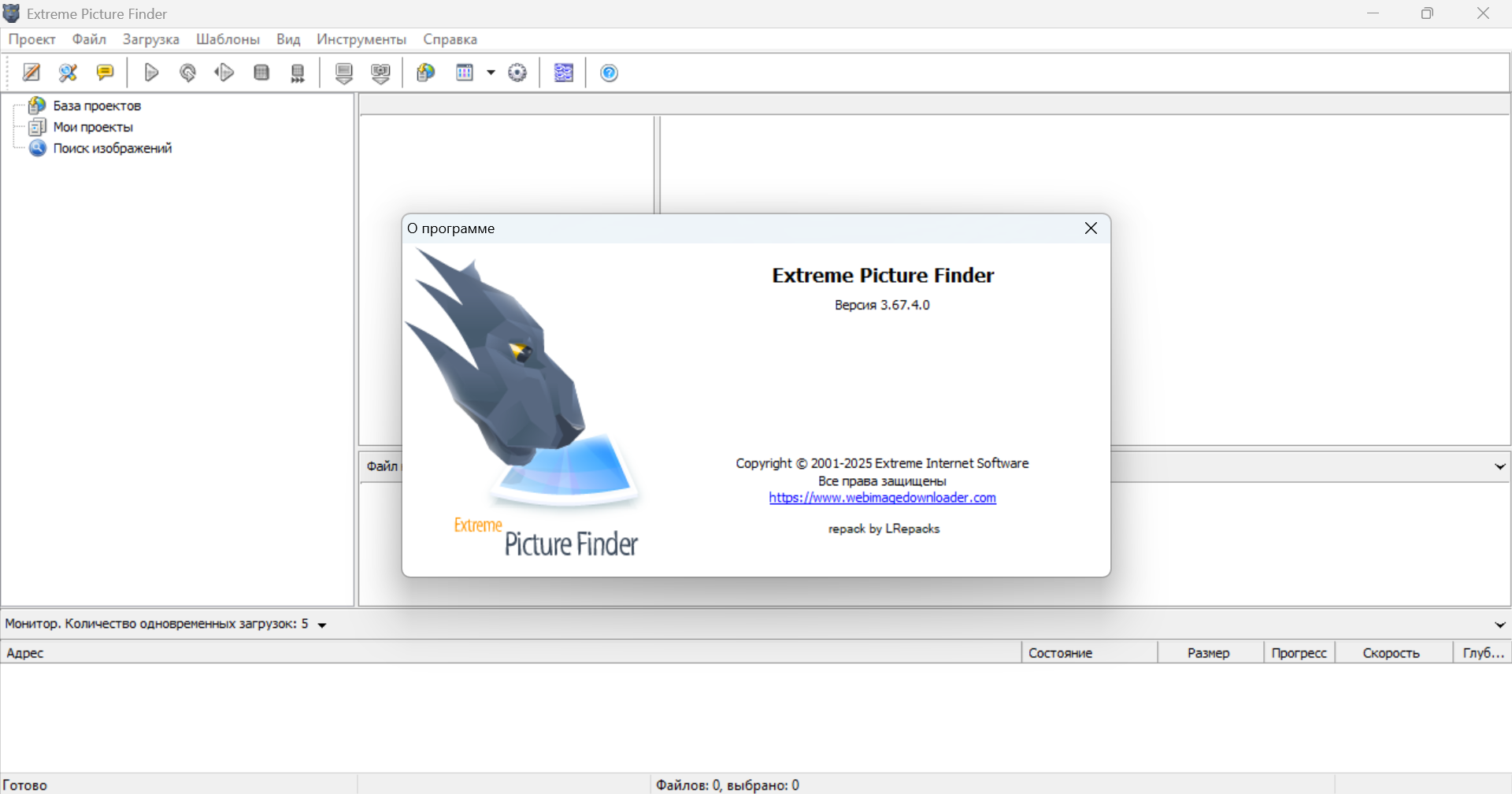 Описание: Extreme Picture Finder - средство для автоматического поиска, загрузки и сохранения любых файлов (картинки, видео, музыка, архивы, флэш и т.д.) с Интернет сайтов, а также для поиска картинок в Интернет по ключевым словам. Extreme Picture Finder позволит Вам автоматически загрузить только нужные Вам файлы, избавив от просмотра назойливой рекламы, всплывающих окон и т.д. Просто укажите начальный адрес загрузки и тип файлов и предоставьте остальное Extreme Picture Finder! Также имеется встроенный модуль для просмотра загруженных картинок (в режиме уменьшенных изображений или слайд-шоу) и база адресов сайтов разделенных на категории для удобства поиска. В программу встроена функция "просмотра базы данных проектов" в меню "Инструменты". Можно добавить проект из выбранной категории и запустить его.Основные возможности:- Закачивайте и автоматически сохраняйте все изображения, музыку, видео или любые другие файлы