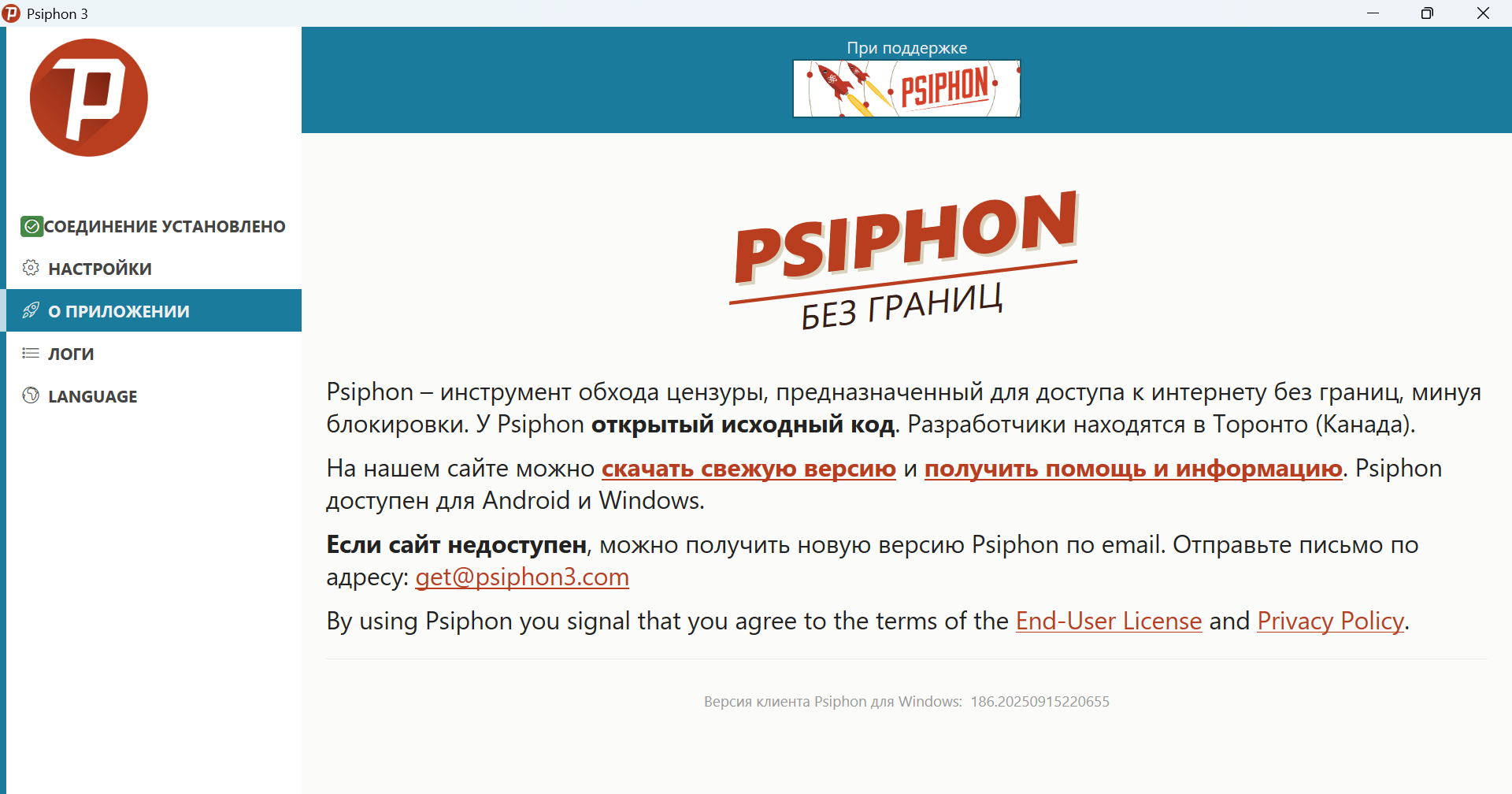 *В модифицированной версии отключено открытие рекламной страницы при соединении и убран PsiCash из интерфейса "Тихая" установка с ключами /SILENT или /VERYSILENT (или файлом "Silent Install.cmd")