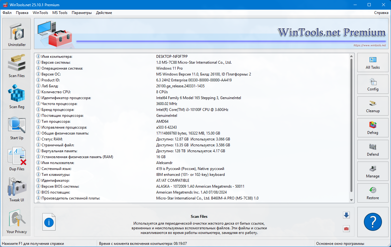 При работе различных программ на жёстком диске создаются временные файлы необходимые для их правильной работы. Достаточно часто происходят ситуации, когда временные файлы не удаляются (зависание компьютера или программ, не корректный выход из программы или системы) и остаются на жестком диске захламляя его и безосновательно занимая пространство. Иногда большое количество временных файлов замедляет загрузку компьютера и работу в целом. Для периодической очистки компьютера от временных и не используемых файлов служит инструмент «Scan Files».