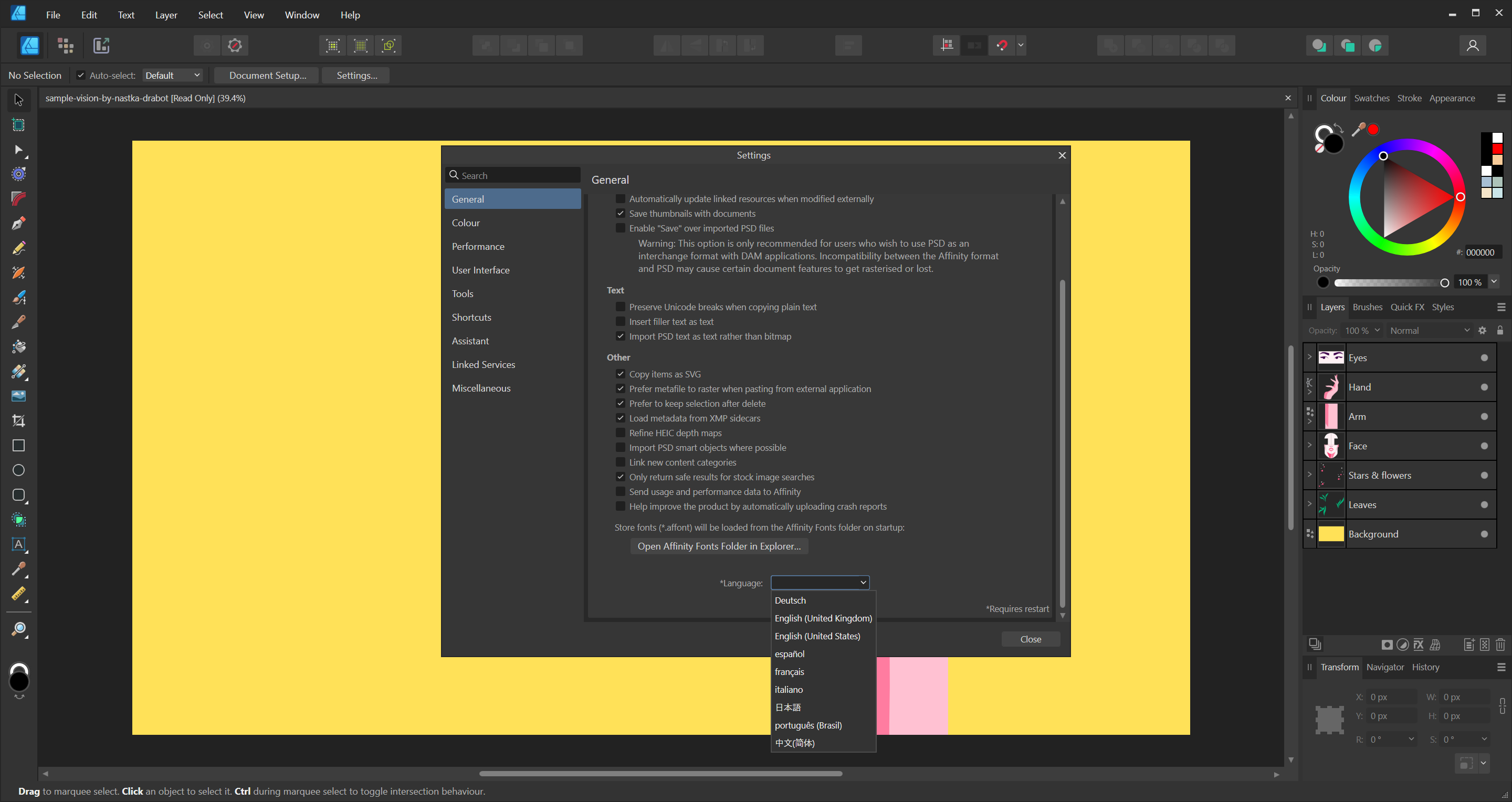 В основе серверной технологии Affinity Designer — расширенная поддержка файлов. Включена поддержка всех основных типов изображений и векторных файлов, в том числе полная поддержка многослойных PSD-файлов, поэтому вы можете выводить документы непосредственно для печати, отображения в веб-браузере или передачи в другие приложения.