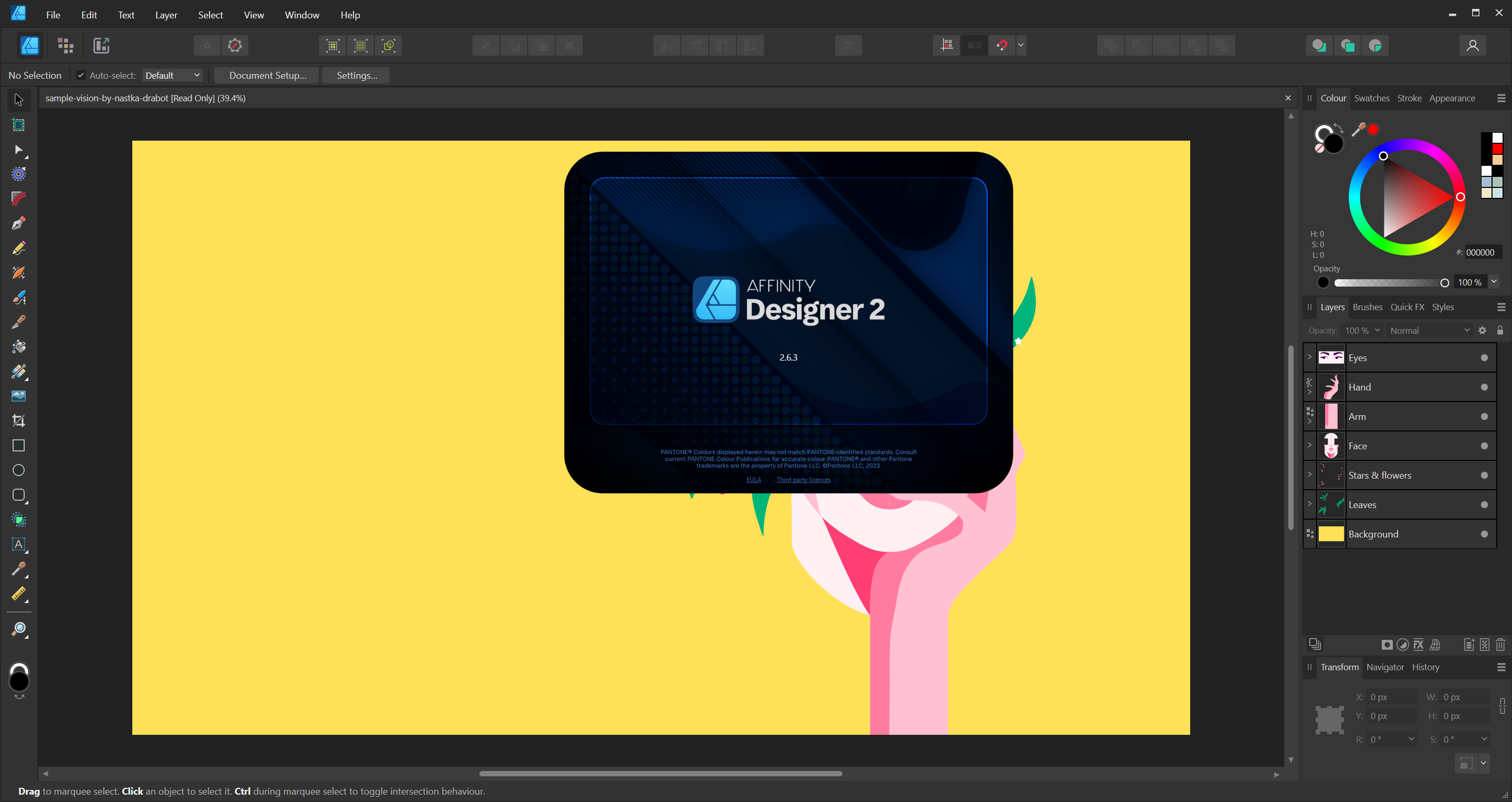Одним из наиболее важных аспектов Affinity Designer является возможность мгновенно переключаться на работу с пикселями. Рисуйте с помощью растровой кисти для того, чтобы добавлять текстуры, накладывать маски, делать пиксельные выделения и даже добавлять слои неразрушающих корректировок. Все без необходимости закрывать приложение.
