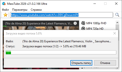 MassTube — очень простая в использовании программа для скачивания видео с YouTube (и не только) с помощью одного клика. Достаточно в строку поиска вставить адрес понравившегося ролика и нажать поиск, после чего программа предоставит список форматов и разрешений, в которых можно быстро скачать данный клип.
