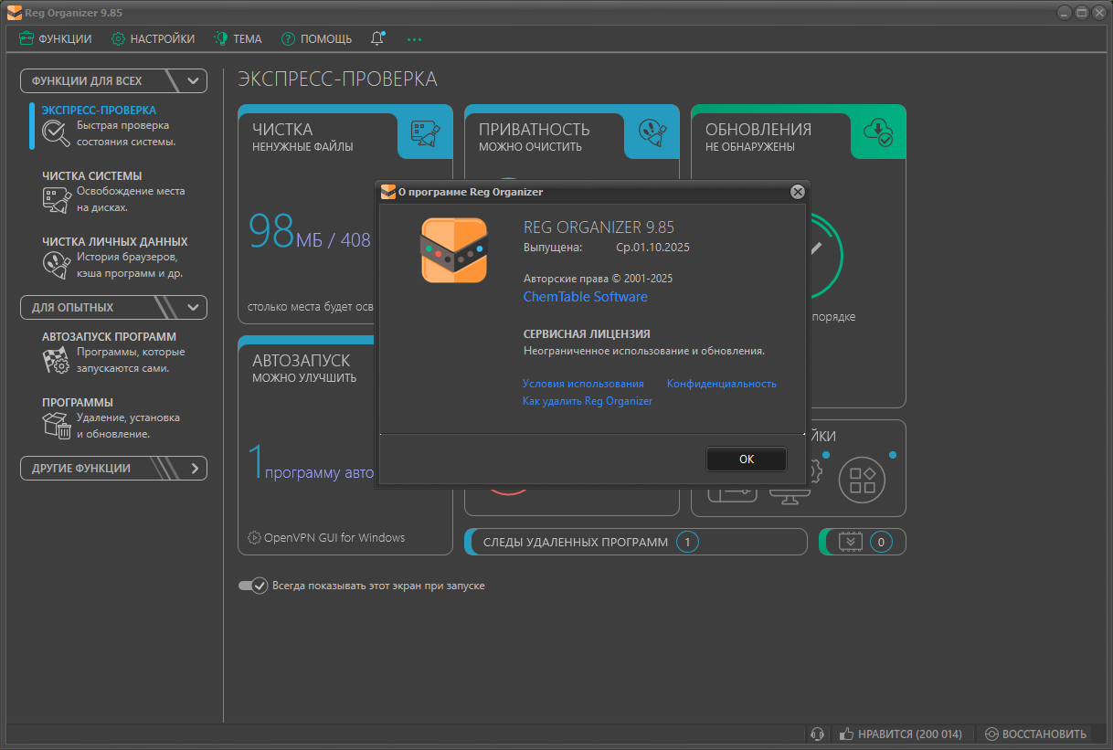 Reg Organizer® - это многофункциональная программа для комплексного обслуживания системного реестра операционных систем Micorosft Windows. Позволяет проводить чистку реестра, его сжатие и дефрагментацию. Имеет мощный редактор системного реестра и расширенную функцию поиска и замены данных. С помощью утилиты Reg Organizer можно осуществлять предварительный просмотр импортируемых reg-файлов (в том числе и из Проводника). Кроме того, позволяет производить полное удаление программного обеспечения (основана на технологии Full Uninstall™), подчищая все "хвосты", которые остаются в системе при обычном удалении.