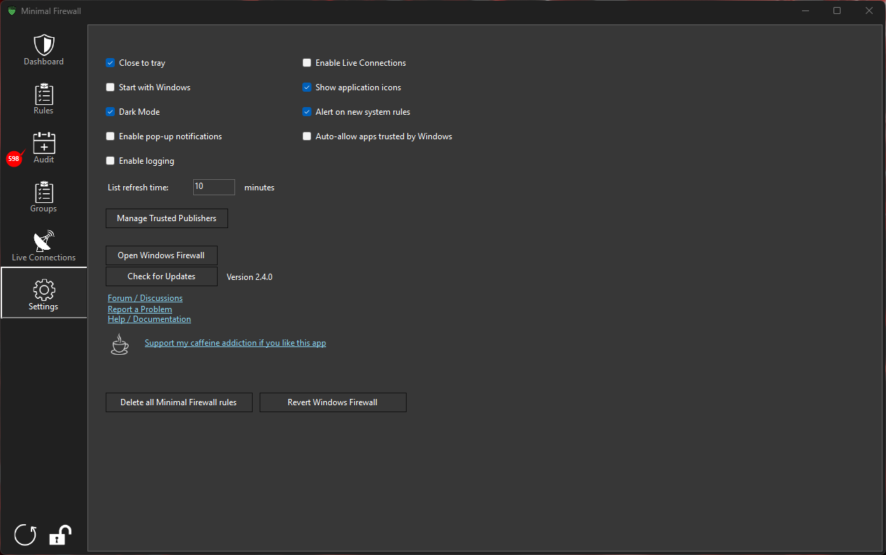 Minimal Firewall расширяет возможности встроенного брандмауэра Windows, блокируя все неизвестные сетевые соединения по умолчанию, предоставляя вам полный контроль. Он запрашивает действие при попытке приложения подключиться, позволяя вам нейтрализовать вредоносное ПО, блокировать нежелательную телеметрию и предотвращать утечки данных. Minimal Firewall не позволит ни одному приложению «звонить домой» без вашего явного разрешения. В отличие от большинства других программ-брандмауэров, Minimal Firewall действует как интерфейс, предотвращая расширение поверхности атаки вашего компьютера за счёт манипуляций с более низкими уровнями WFP. Minimal Firewall также имеет функцию аудита для проверки новых правил, добавленных в брандмауэр Windows. При использовании приложения WFP оно действует как фильтр поверх брандмауэра Windows. Проблема в том, что Microsoft устанавливает различные уровни важности для своих правил брандмауэра (например, правила, изменённые в редакторе групповой политики или связанные с Защитником Windows, могут иметь более высокий уровень важности). Поэтому в случае конфликта фильтра и правил брандмауэра Windows неясно, какое из них имеет приоритет. Minimal Firewall избегает этого, работая напрямую с брандмауэром Windows, не отключая этот ключевой элемент безопасности Windows.