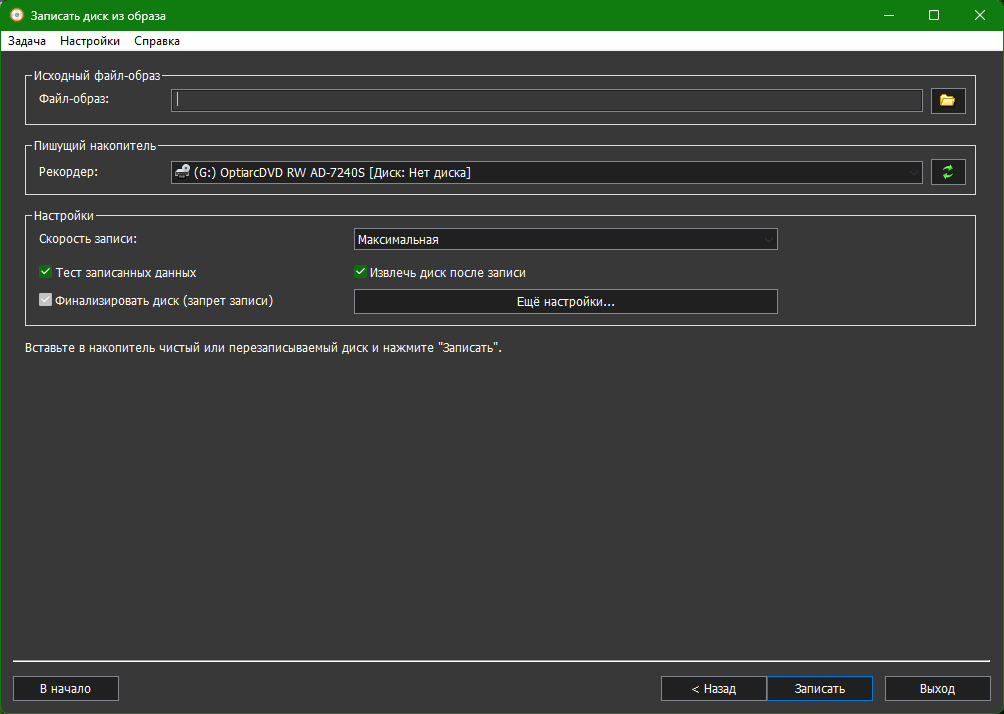 Any Burn - небольшая бесплатная утилита для работы с CD/DVD/Blue-ray дисками. Интерфейс программы достаточно удобен: главное окно представляет собой набор закладок, которые выбираются в зависимости от конкретной задачи. Можно записать на диск готовые образы или отдельные файлы и папки, записать Audio-CD из имеющихся файлов аудиоформата, стереть перезаписываемый диск, создать образ диска или отдельных папок/файлов, скопировать диск и др. операции. Этот инструмент станет неплохой альтернативой существующим платным и "тяжелым" программам по управлению CD/DVD/Blue-ray дисков.