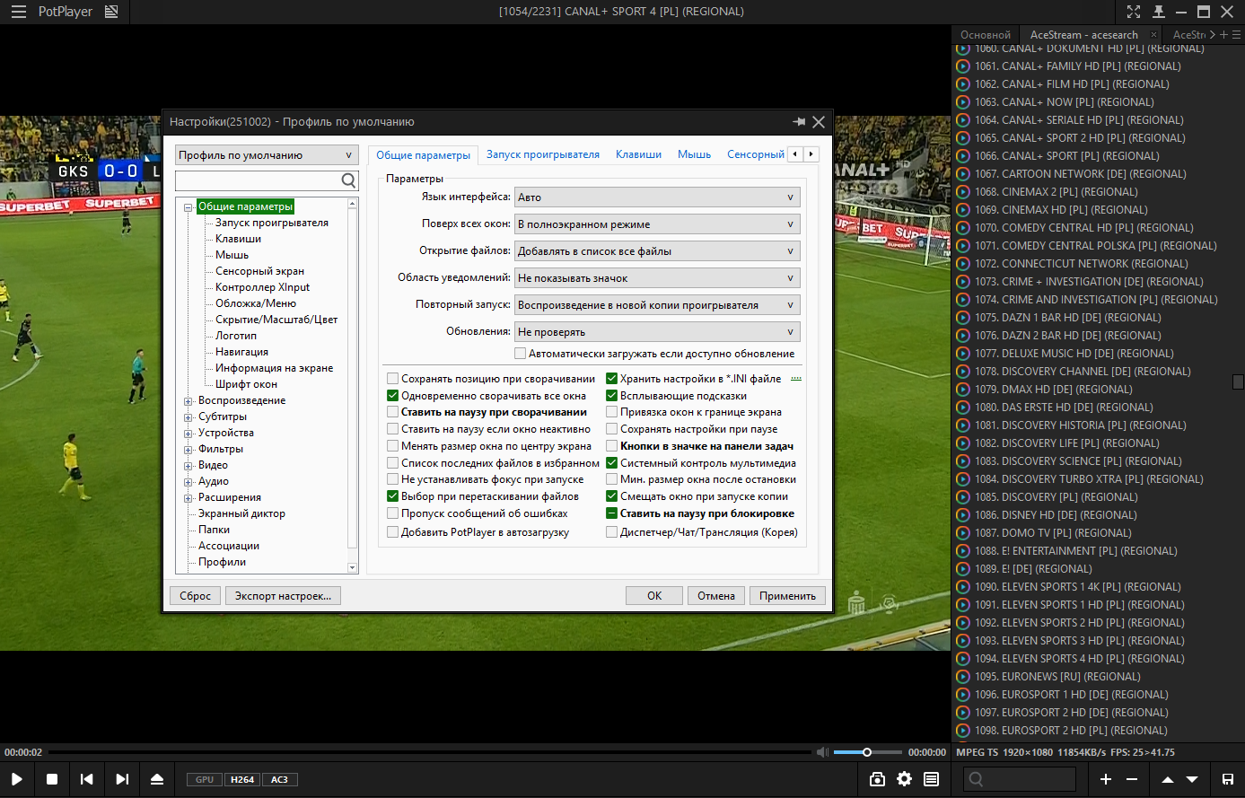 1) закрывает PotPlayer и движок ace engine, если уже запущены (для предотвращения дублирования процессов)