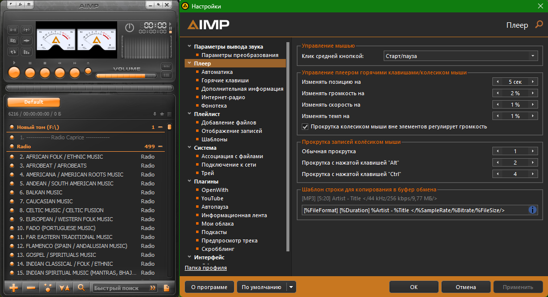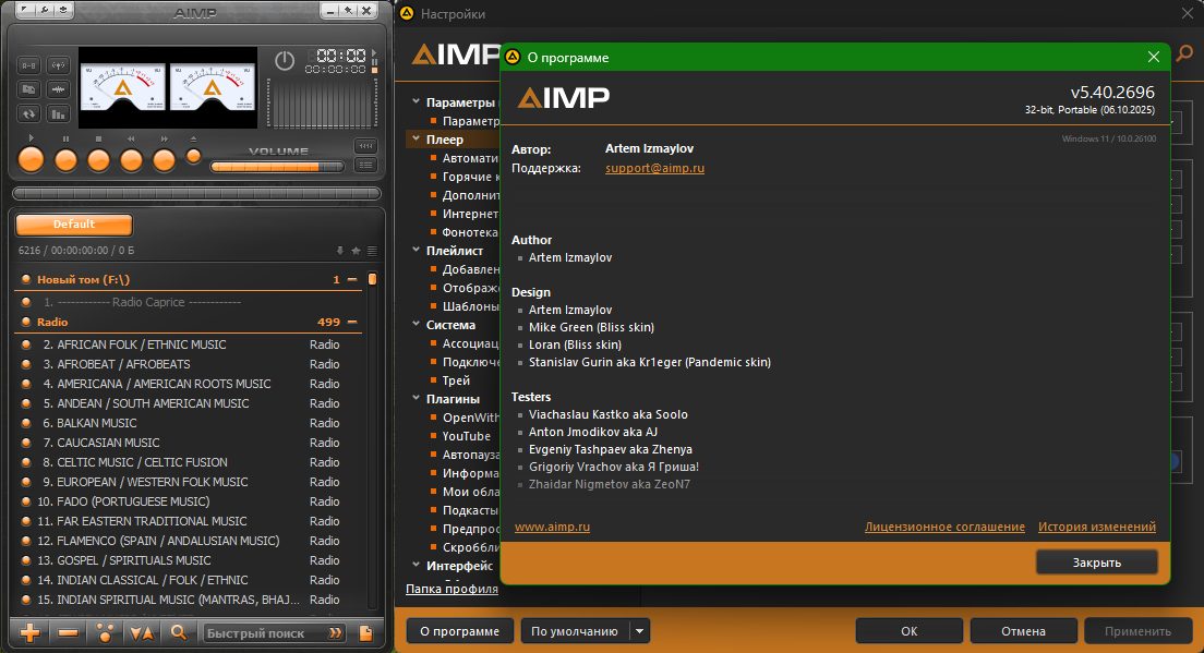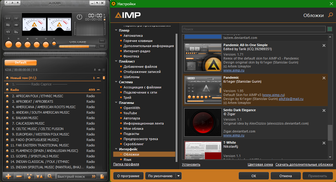 скинов, кодировщиков, плейлист радиостанций: Radio Caprice, 101.RU, Зайцев.FM, DI FM, 1.FM,