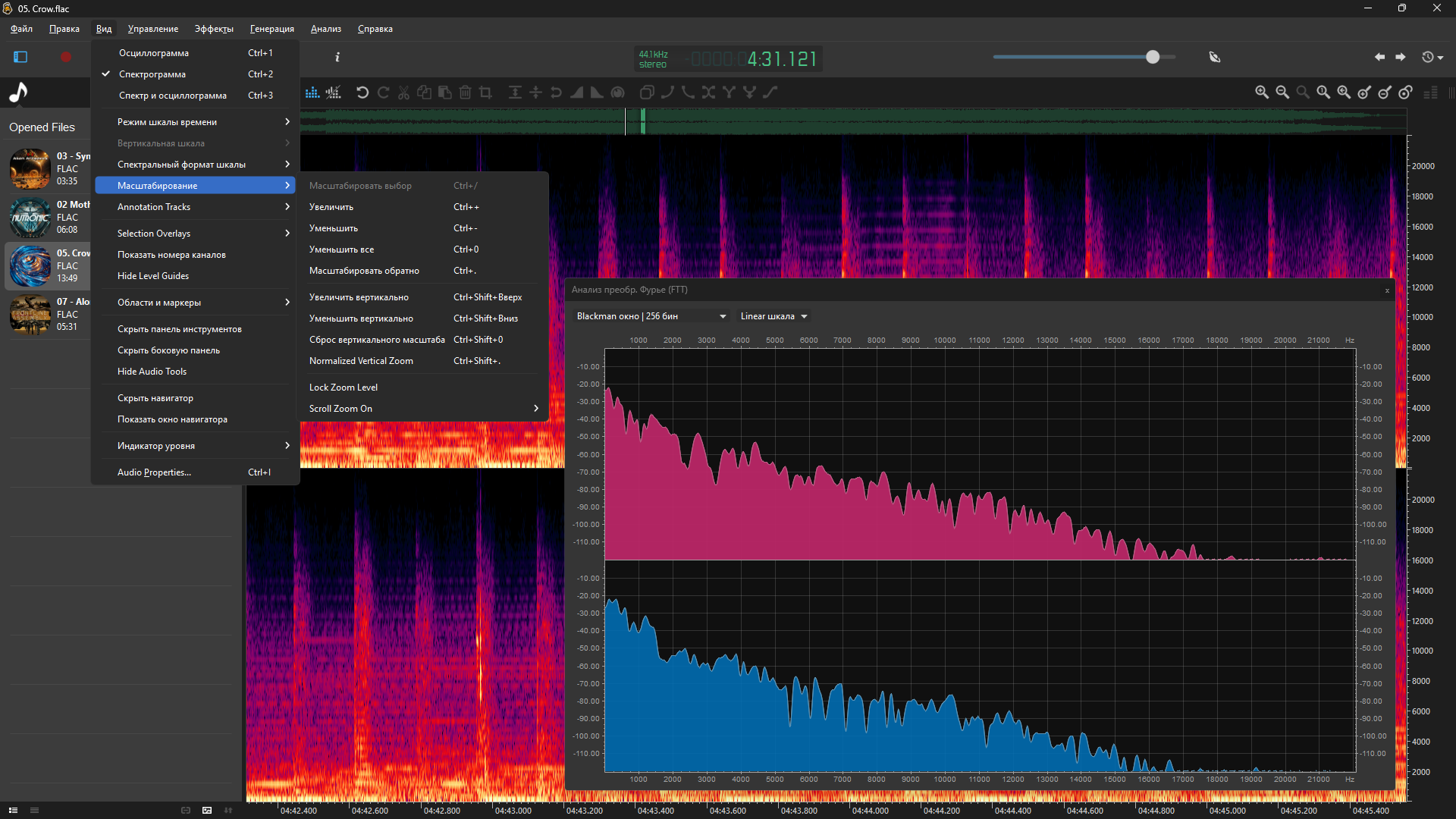 - Продвинутые пользователи будут удивлены, обнаружив, что параметры спектрограммы применяются в режиме реального времени. Дисплей обновляется сразу после изменения функций, таких как количество частотных полос, window type and size и динамический диапазон отображения.