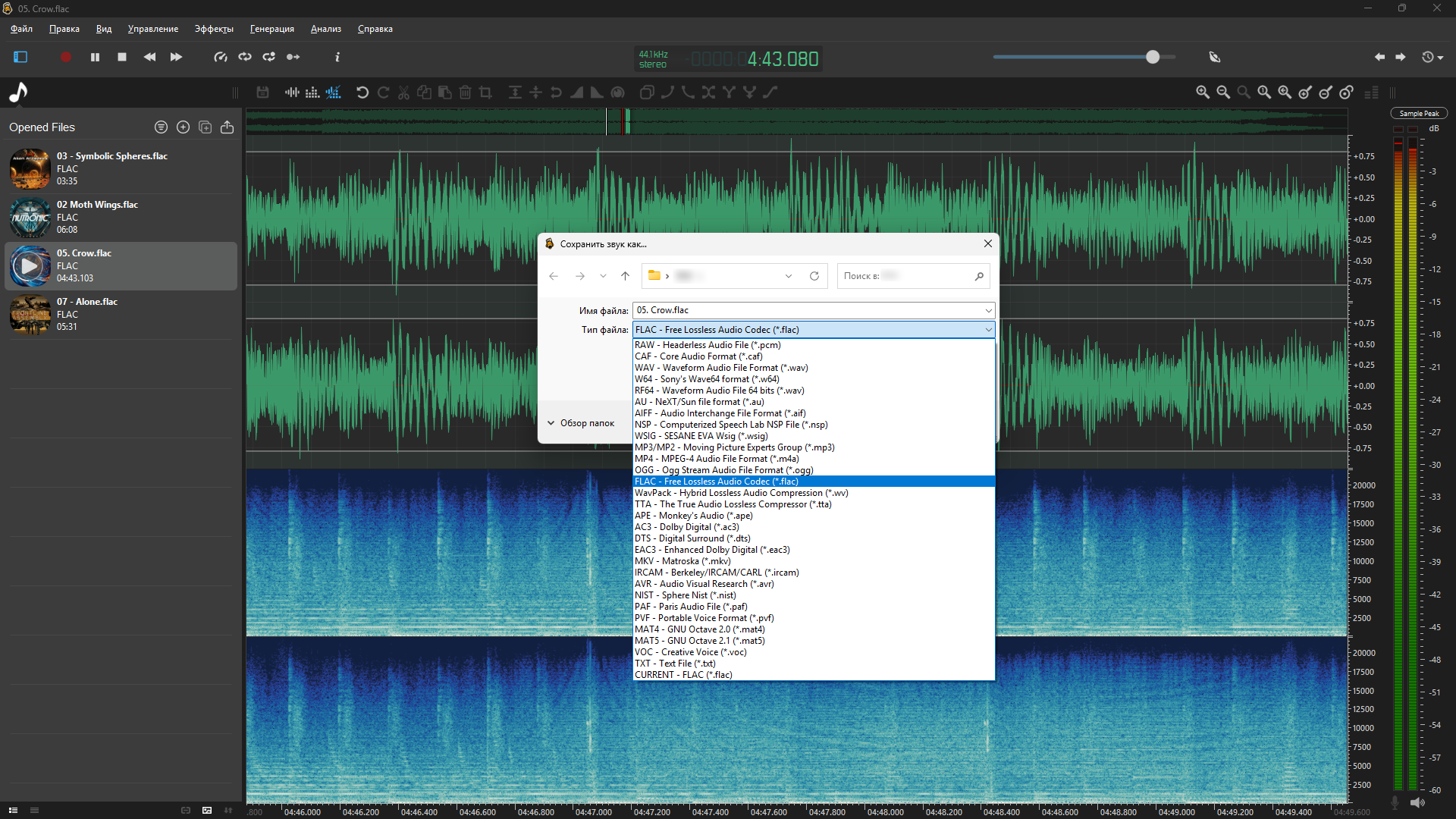 - ocenaudio позволяет переключить внешний вид сигнала в вид спектрограммы или комбинированный, форма + спектрограмма режим, в этом представлении можно анализировать спектральный состав звукового сигнала с максимальной четкостью.