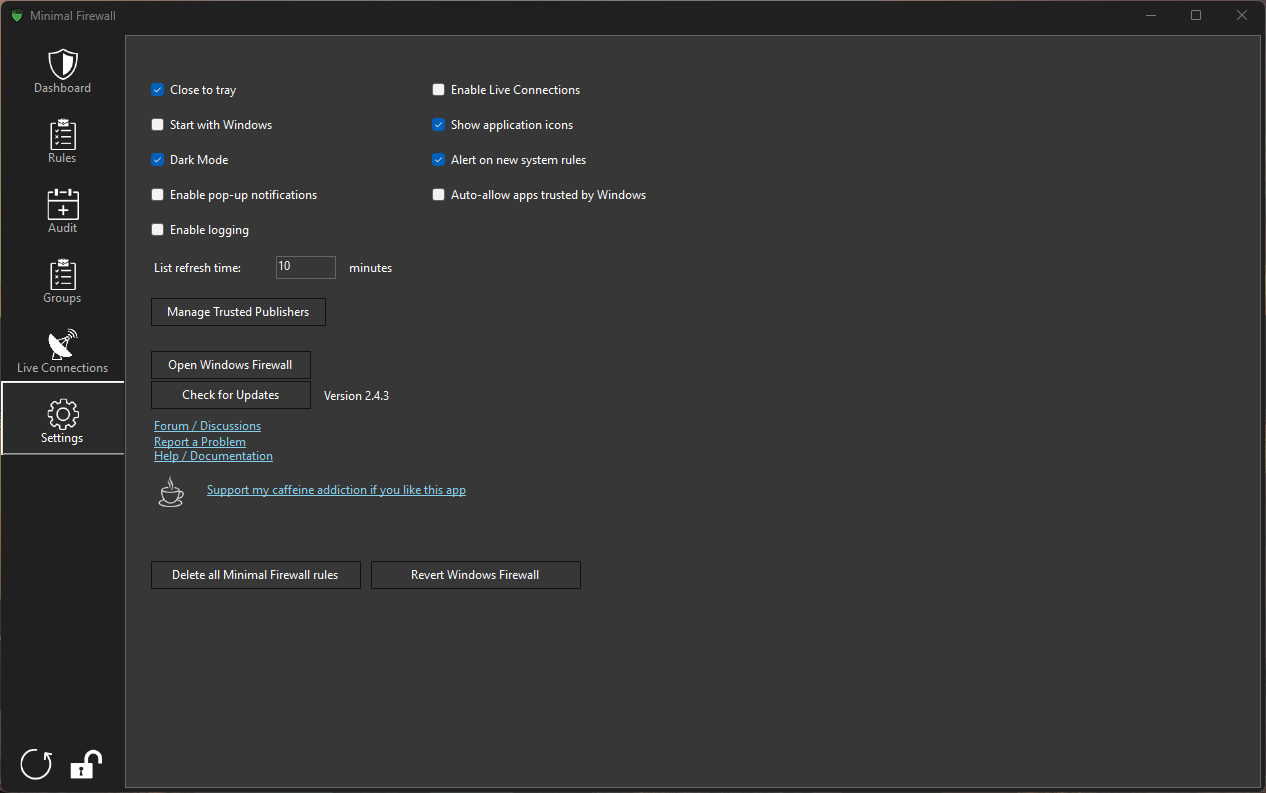 Minimal Firewall расширяет возможности встроенного брандмауэра Windows, блокируя все неизвестные сетевые соединения по умолчанию, предоставляя вам полный контроль. Он запрашивает действие при попытке приложения подключиться, позволяя вам нейтрализовать вредоносное ПО, блокировать нежелательную телеметрию и предотвращать утечки данных. Minimal Firewall не позволит ни одному приложению «звонить домой» без вашего явного разрешения. В отличие от большинства других программ-брандмауэров, Minimal Firewall действует как интерфейс, предотвращая расширение поверхности атаки вашего компьютера за счёт манипуляций с более низкими уровнями WFP. Minimal Firewall также имеет функцию аудита для проверки новых правил, добавленных в брандмауэр Windows. При использовании приложения WFP оно действует как фильтр поверх брандмауэра Windows. Проблема в том, что Microsoft устанавливает различные уровни важности для своих правил брандмауэра (например, правила, изменённые в редакторе групповой политики или связанные с Защитником Windows, могут иметь более высокий уровень важности). Поэтому в случае конфликта фильтра и правил брандмауэра Windows неясно, какое из них имеет приоритет. Minimal Firewall избегает этого, работая напрямую с брандмауэром Windows, не отключая этот ключевой элемент безопасности Windows.