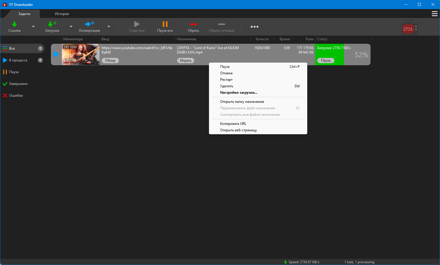 YT Downloader имеет продвинутый механизм ускорения загрузки, который позволяет загружать видео на 500% быстрее, чем обычная скорость. Скачать видео 4K, 2K, HD 1080p и 720p с YouTube
