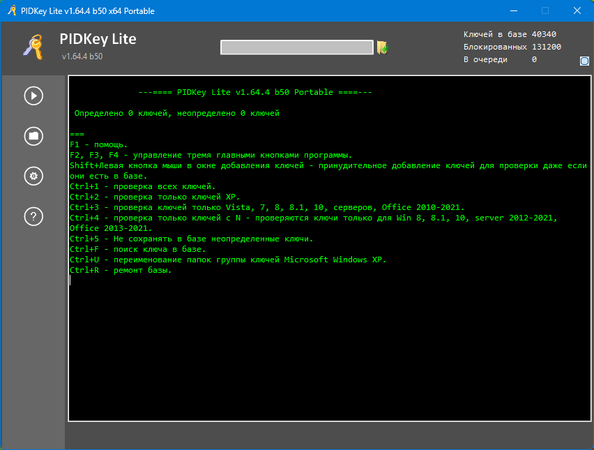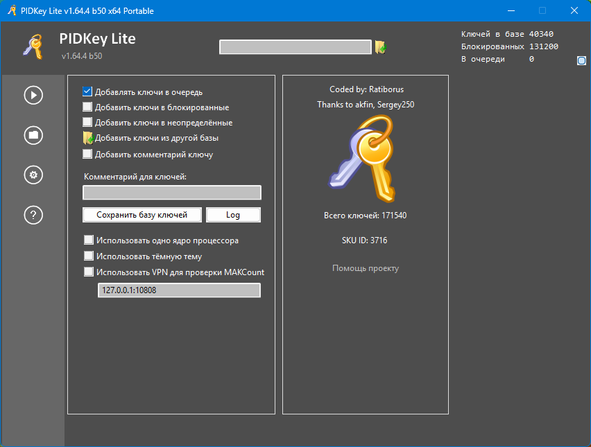 Она позволяет заменить PIDKey by Ratiborus, Ultimate PID Checker by janek2012 и VAMT. Программа PIDKey Lite является правопреемницей PIDKey и взяла из нее лучшие идеи. Основной особенностью программы является создание SQL-базы в отличие от PIDKey, где база фактически хранилась в текстовых файлах. Программа позволяет добавлять новые ключи в двух режимах (режимы добавления ключей будут описаны ниже) и проверять их, находить в базе нужные ключи, обновлять информацию о них и (или) перемещать их в блокированные.