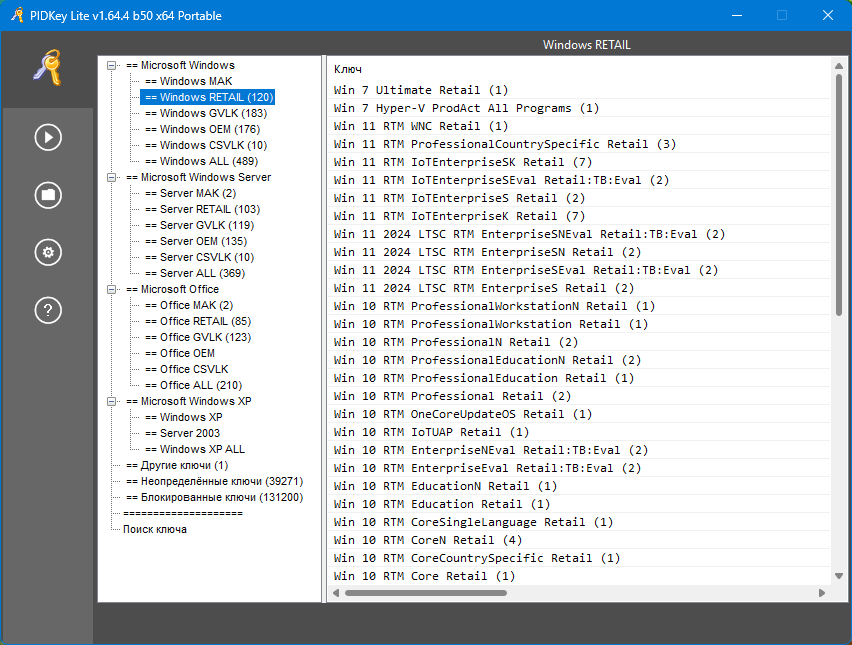 PIDKey Lite предназначена для просмотра, обновления и сохранения в базе информации о ключах для продуктов M$.