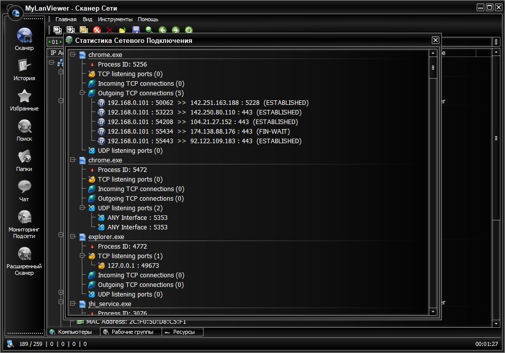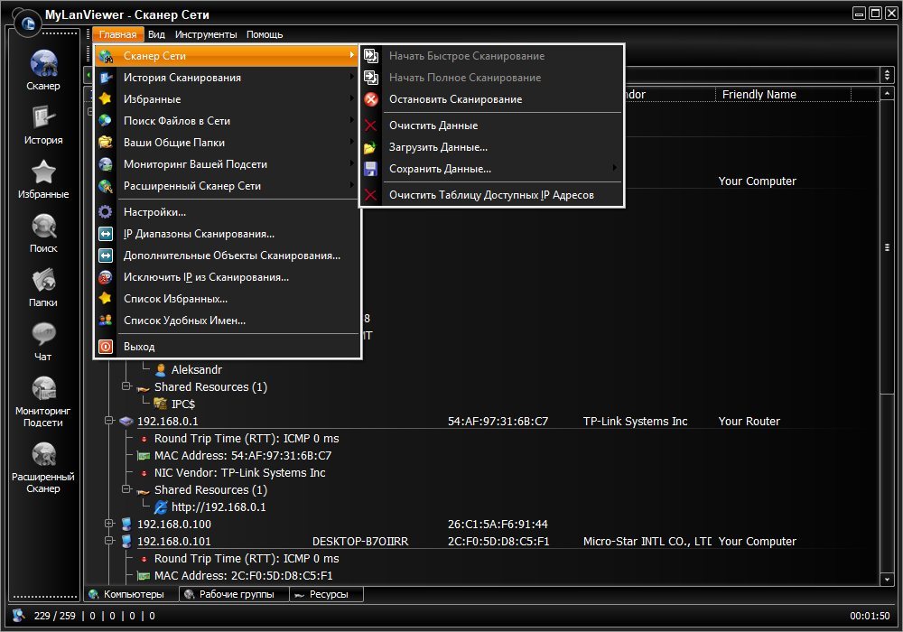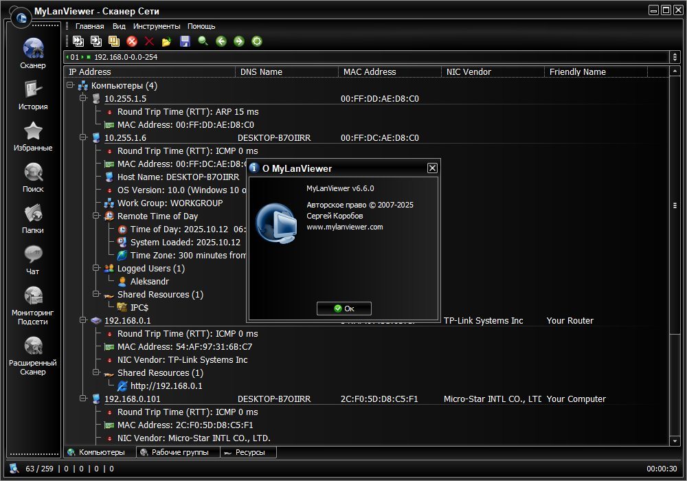 MyLanViewer — программа для сканирования и мониторинга компьютеров в сети с возможностью поиска общедоступных файлов. Она показывает компьютеры в удобном для просмотра виде, который содержит имя компьютера, IP адрес, MAC адрес, общие ресурсы и другие детали для каждого компьютера. С помощью её вы можете следить за компьютерами в сети и получать оповещение, когда состояние одного из них изменится. Также вы можете управлять своими общими ресурсами, запрещать их и закрывать к ним сессии. [cut]