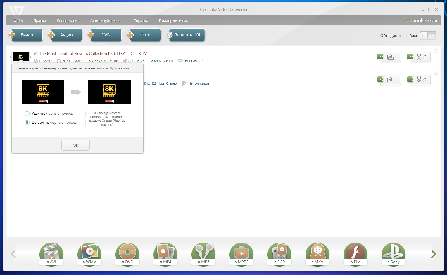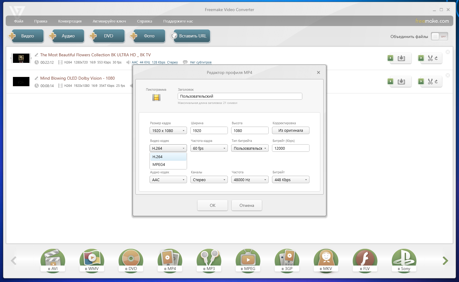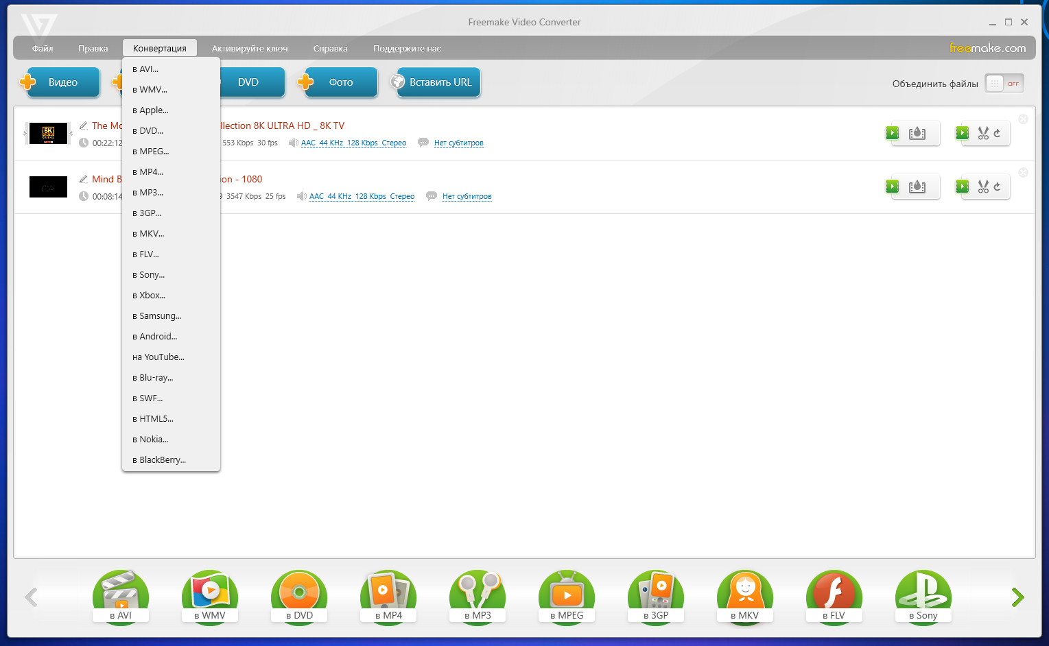 Freemake Video Converter конвертирует видео в таких форматах, как MP4, AVI, MKV, WMV, MP3, DVD, 3GP, SWF, FLV, HD, MOV, RM,QT, Divx, Xvid, TS, Fraps и др. Поддерживаются все современные кодеки: H.264, MKV, MPEG4, AAC. Создавайте видео из аудио и фото. Конвертируйте много файлов одновременно.