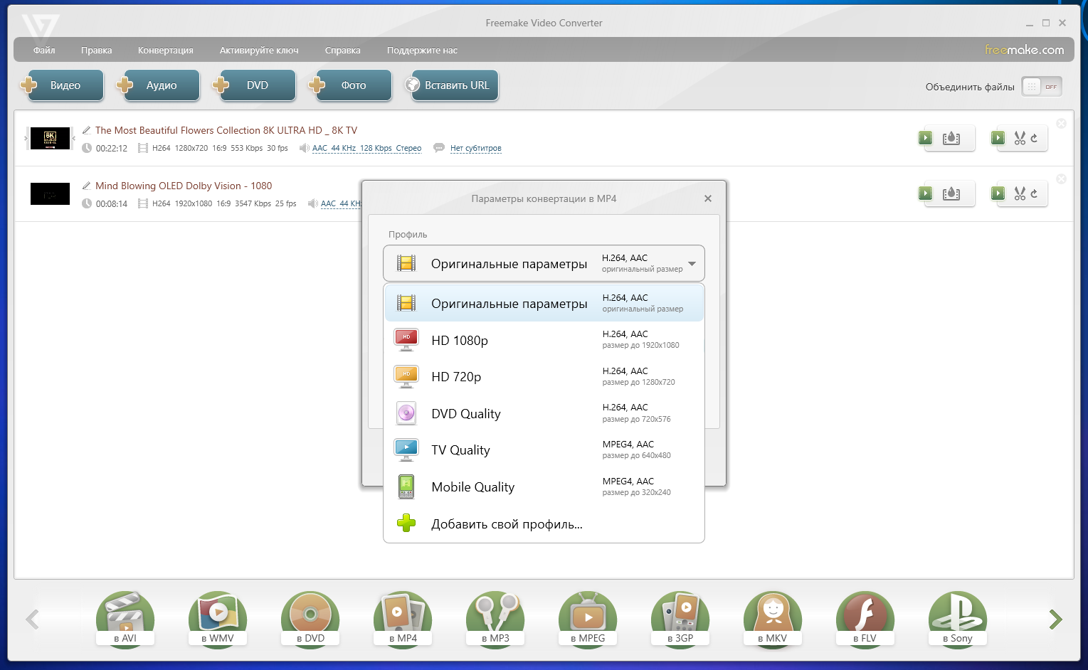 Конвертируйте HD видео без потери качества. Freemake с легкостью обрабатывает видео 4K, Full HD 1080p, HD 720p с любых HD камер.