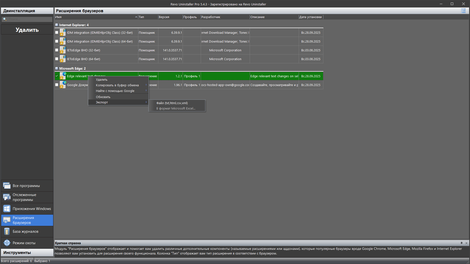 Модуль отслеживания программ не только содержит все созданные записи, но имеет дополнительные функции. Пользователи могут проводить полную очистку с помощью существующей записи в журнале или могут использовать Настраиваемое удаление, которое позволяет выбрать файлы, папки и записи Реестра, которые следует удалить. В дополнение к базовым функциям удаления, переименовывания и изменения иконки записи Revo Uninstaller Pro предлагает расширенные функции управления записями, включая просмотр и экспорт содержимого журналов в виде текстового или HTML файла, а также экспорт журнала в собственном формате, который позднее можно импортировать на этом или другом компьютере, что позволяет делиться журналами между пользователями и компьютерами.