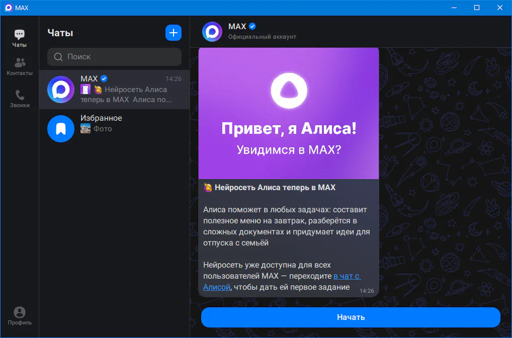Быстрое и лёгкое приложение для общения и решения повседневных задач. Общайтесь в удовольствие благодаря высокому качеству связи и быстрому соединению даже в сетях со слабым сигналом. Анимированные стикеры, реакции в чатах, возможность отправки файлов до 4 ГБ – все необходимое для того, чтобы делиться настроением и важной информацией. В MAX можно войти сразу с нескольких устройств, используя свой основной номер мобильного телефона. Чаты и звонки будут синхронизироваться между устройствами. Доступна Веб-версия.