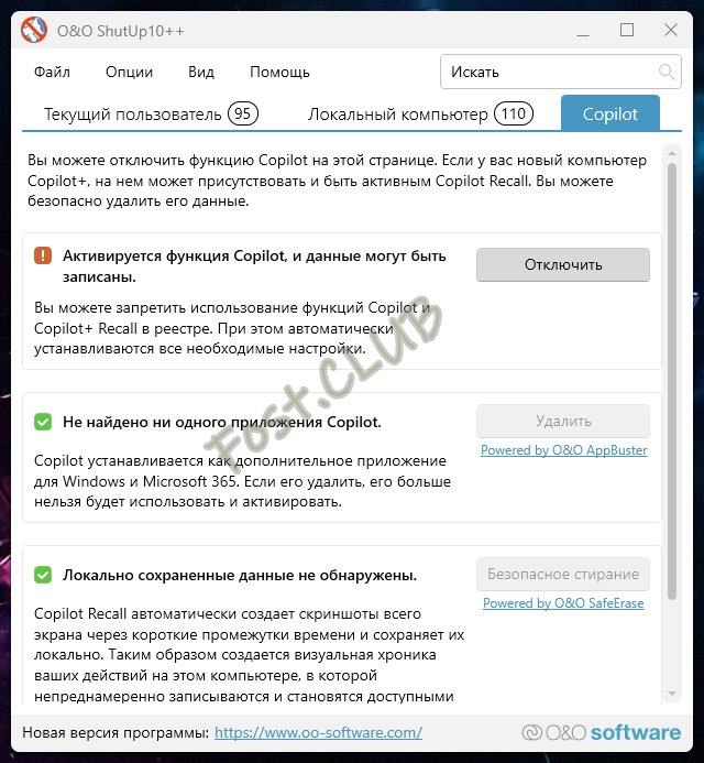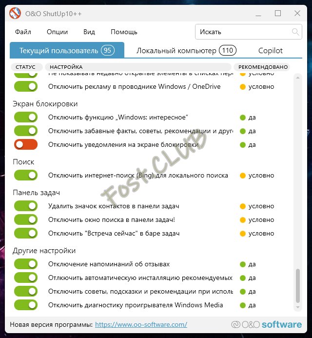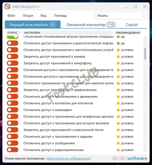 Основные возможности O&O ShutUp10: