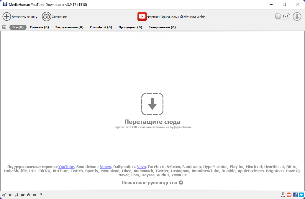 Полная поддержка функции "drag&drop". Просто перетащите ссылку на видео с помощью мыши и бросьте ее на главное окно приложения или на значок в доке (для Mac).