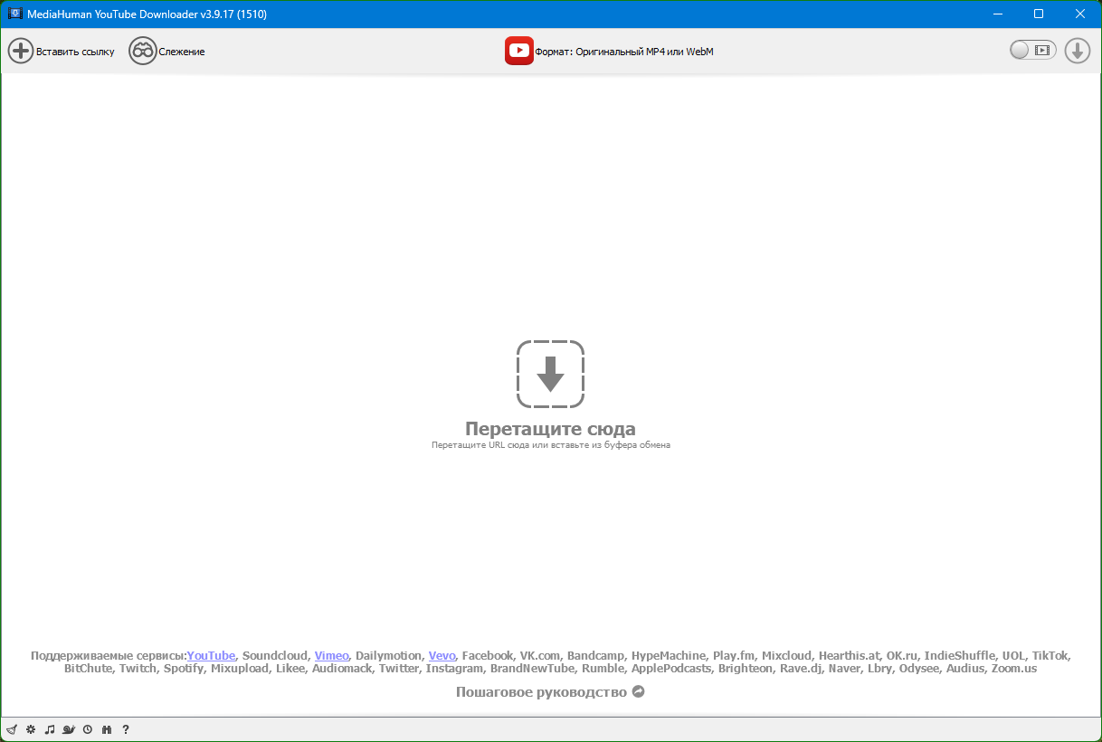 Полная поддержка функции "drag&drop". Просто перетащите ссылку на видео с помощью мыши и бросьте ее на главное окно приложения или на значок в доке (для Mac).