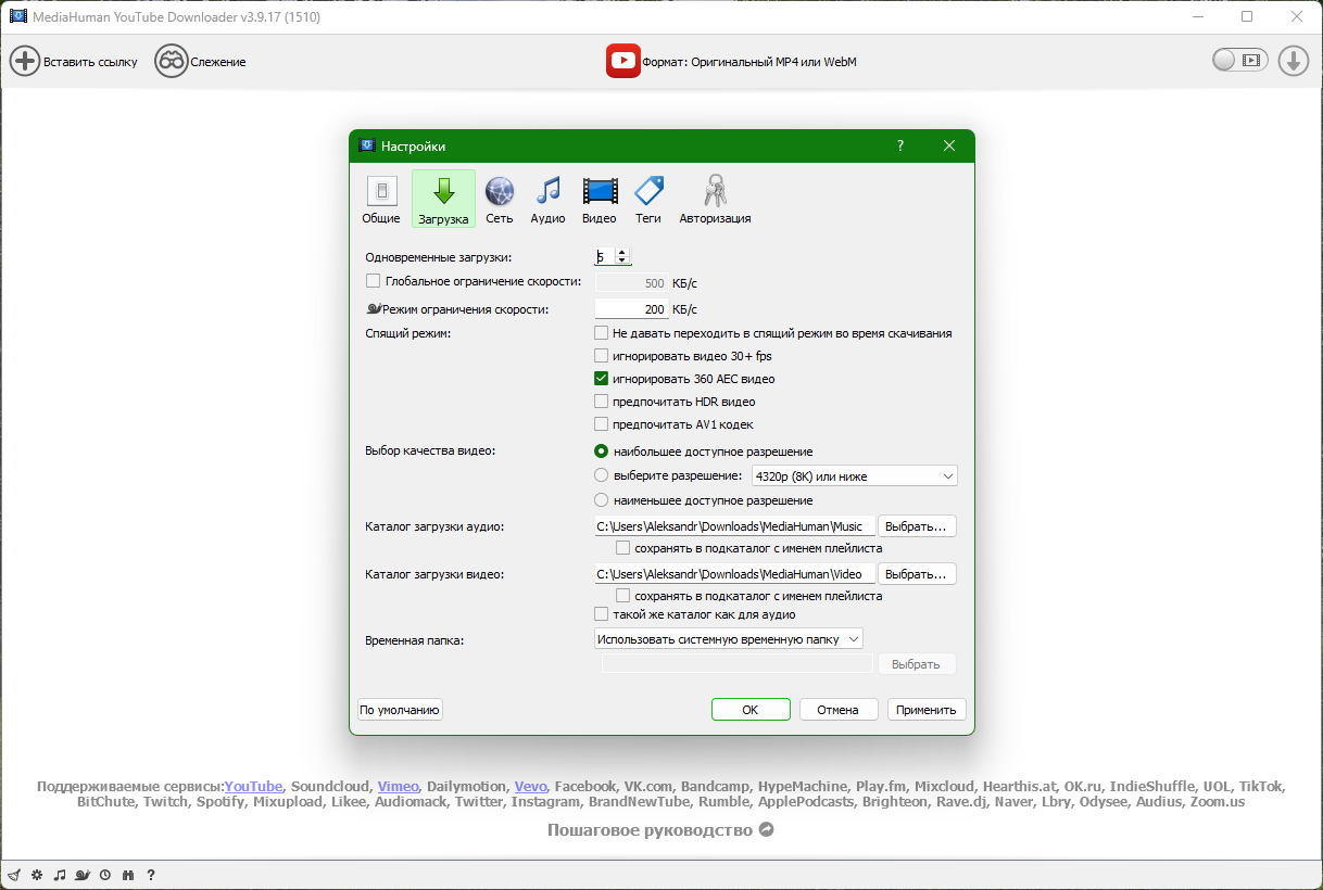 Программа поддерживает загрузку всех доступных разрешений, но выбор остается за вами, будет это 720p, 1080p, 4K или 8K, 60 fps или 30.