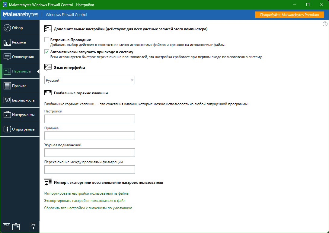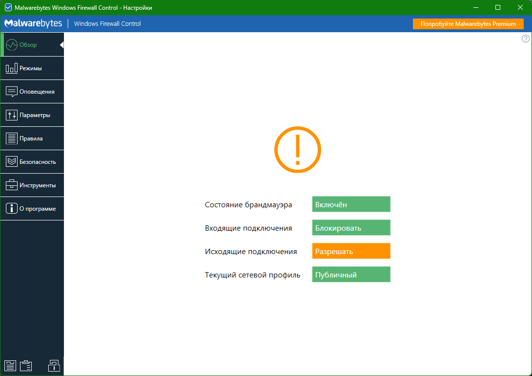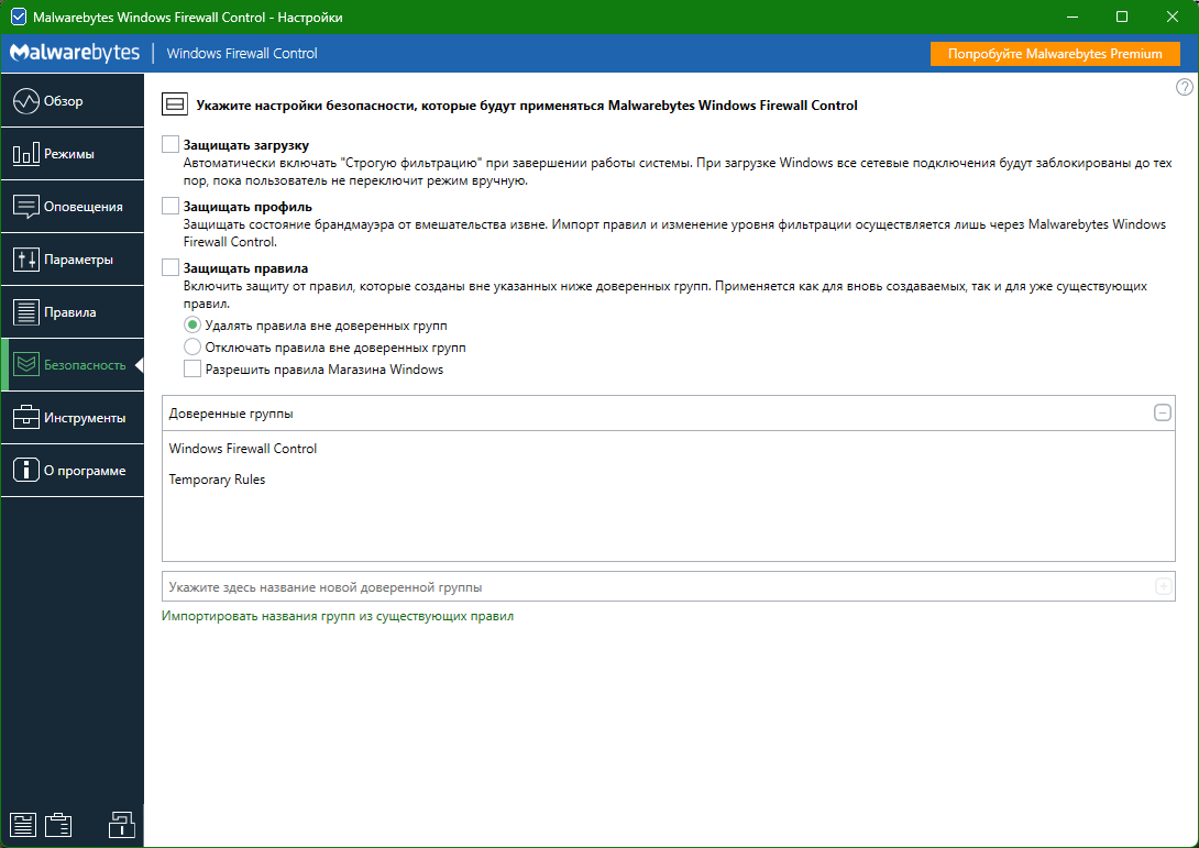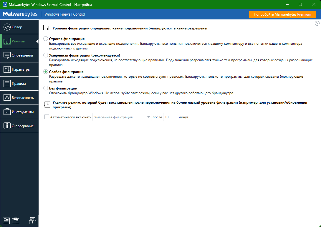 • Нет фильтрации - Malwarebytes Windows Firewall Control отключен. Возможности программы: