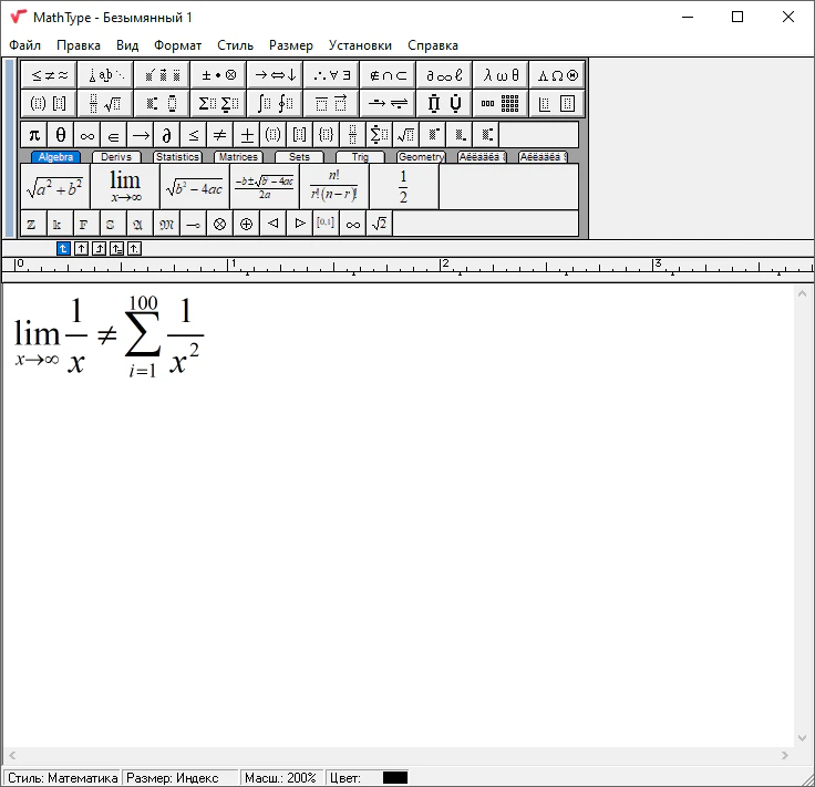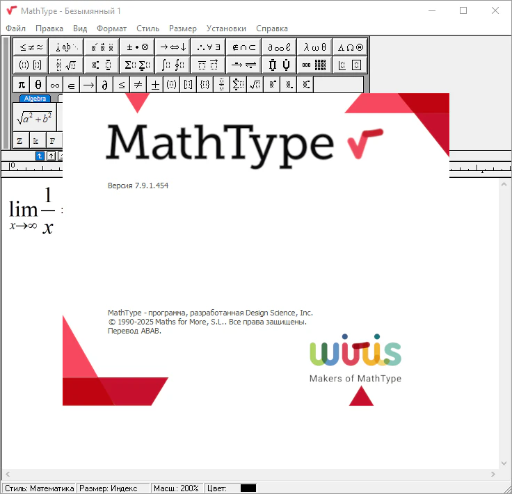 MathType - это интерактивный инструмент, который кардинально меняет способ создания печатных и электронных документов, содержащих математические формулы. Design Science MathType применяется совместно с любым текстовым и HTML-редактором, презентационной или издательской программой, и другими типами программного обеспечения для создания формул в научных статьях, учебных материалах, на веб-страницах, в слайд-презентациях, журнальных статьях и книгах.