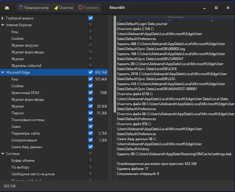 • BleachBit имеет возможность предварительного просмотра всех намеченных действий, а после завершения, возможен просмотр выполненных процедур с выводом размера освобождённого пространства.