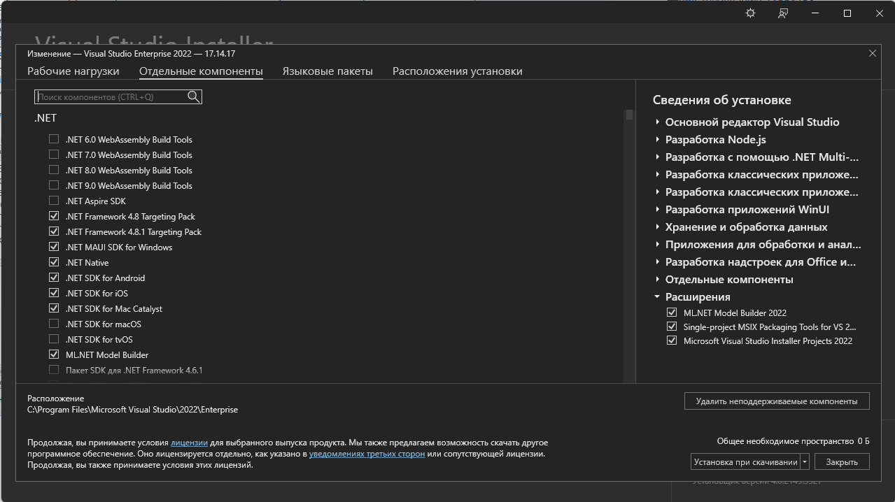 Для работы Visual Studio требуется .NET Framework 4.8. Если .NET Framework 4.8 еще не установлен, он будет установлен во время установки.