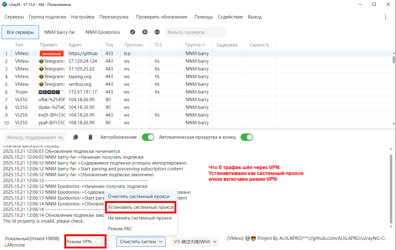 • Далее либо врубаем режим VPN, либо установить системный прокси, либо в нужной нам приложухе прописываем прокси localhost:10808